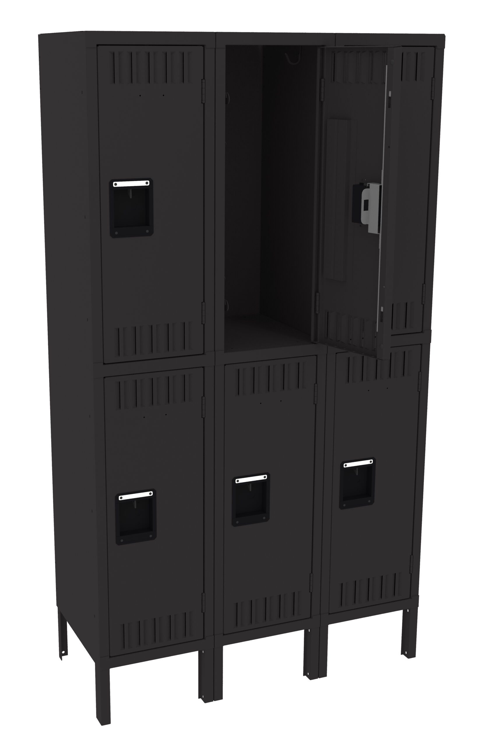 Double Tier lockers feature two openings per locker, giving you twice as many lockers in the same space as a single tier locker. Three coat hooks per opening. Positive 2 point locking system on doors. Flush louvers for ventilation. Door stiffeners add rigidity.