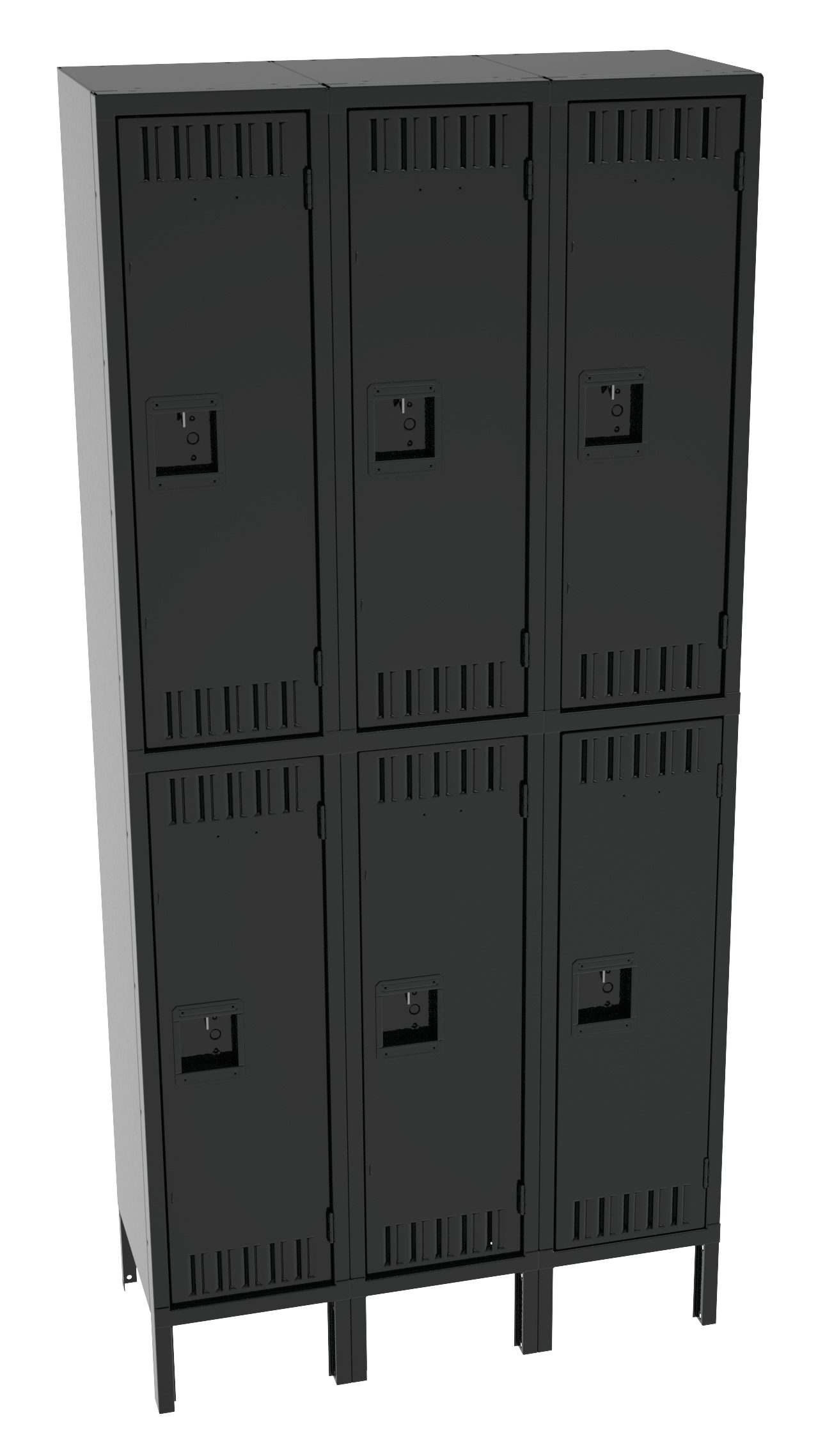 Double Tier lockers feature two openings per locker, giving you twice as many lockers in the same space as a single tier locker. Three coat hooks per opening. Positive 2 point locking system on doors. Flush louvers for ventilation. Door stiffeners add rigidity.