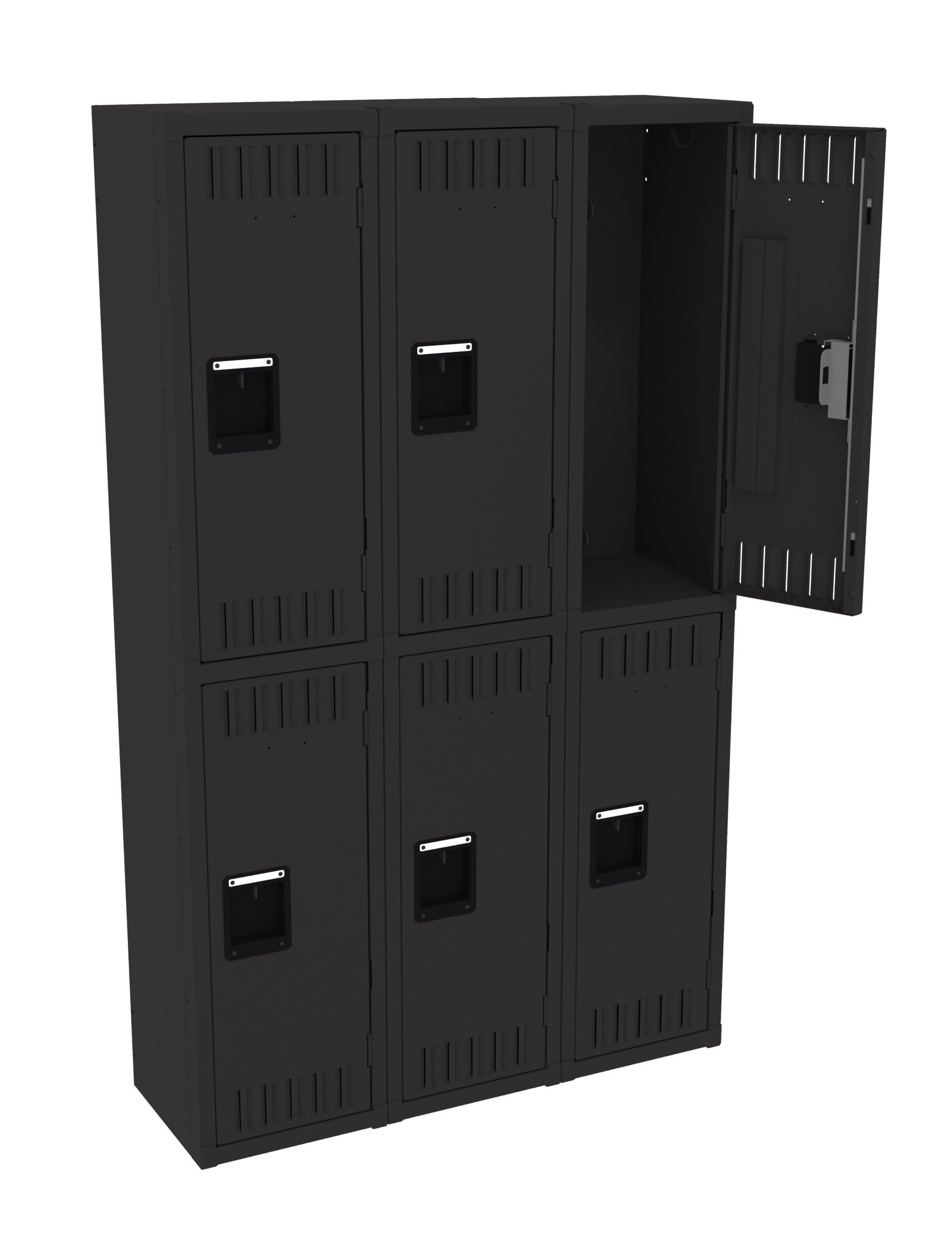 Double Tier lockers feature two openings per locker, giving you twice as many lockers in the same space as a single tier locker. Three coat hooks per opening. Positive 2 point locking system on doors. Flush louvers for ventilation. Door stiffeners add rigidity.