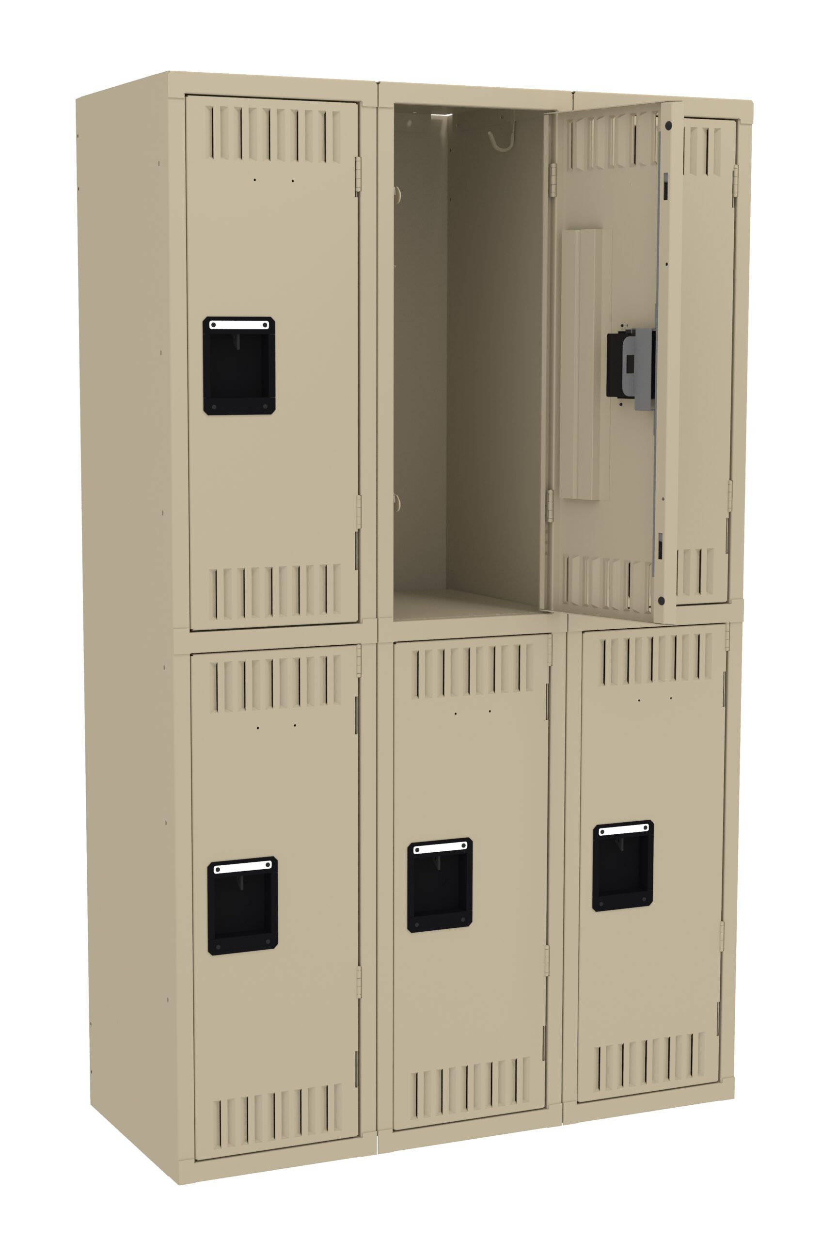 Double Tier lockers feature two openings per locker, giving you twice as many lockers in the same space as a single tier locker. Three coat hooks per opening. Positive 2 point locking system on doors. Flush louvers for ventilation. Door stiffeners add rigidity.