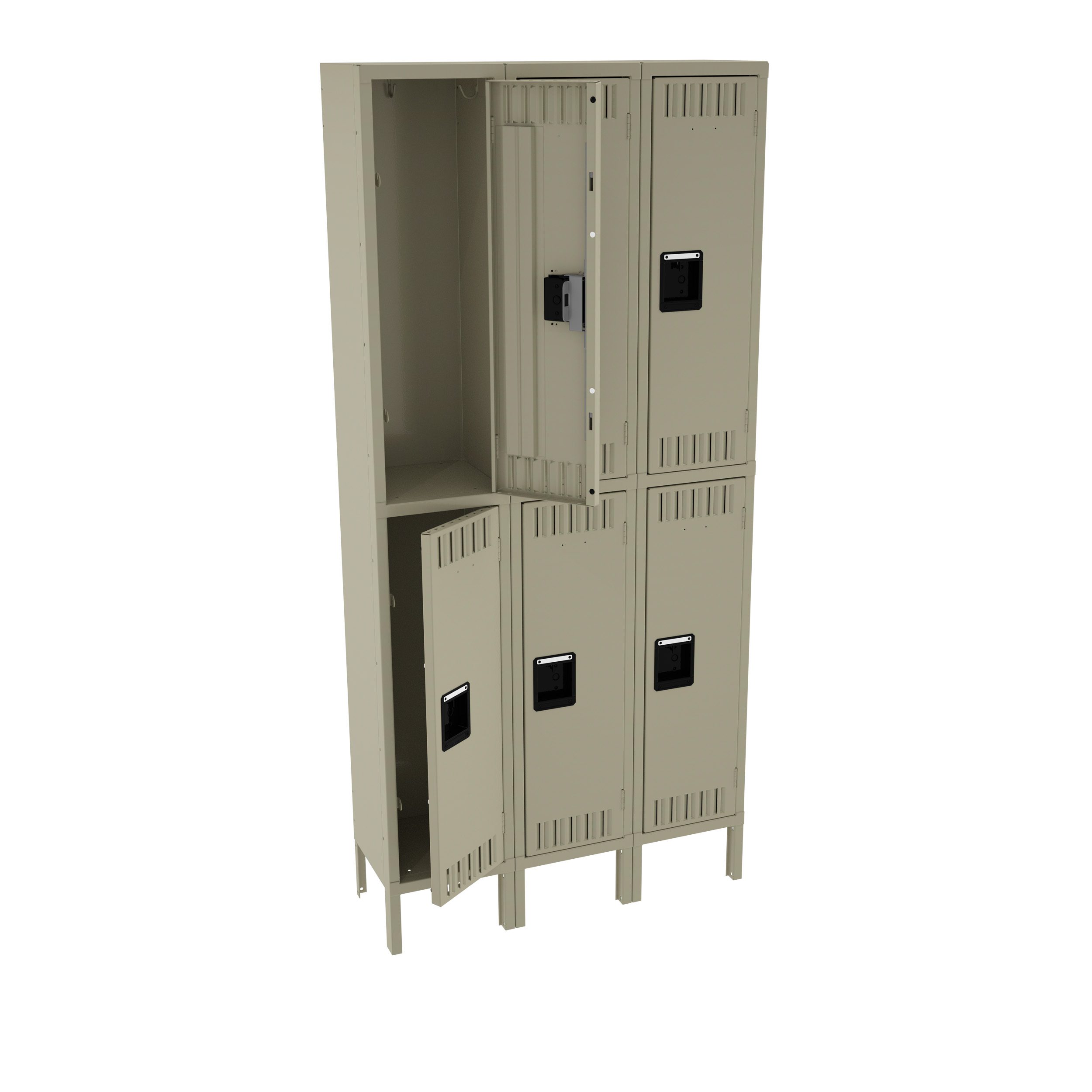 Double Tier lockers feature two openings per locker, giving you twice as many lockers in the same space as a single tier locker. Three coat hooks per opening. Positive 2 point locking system on doors. Flush louvers for ventilation. Door stiffeners add rigidity.