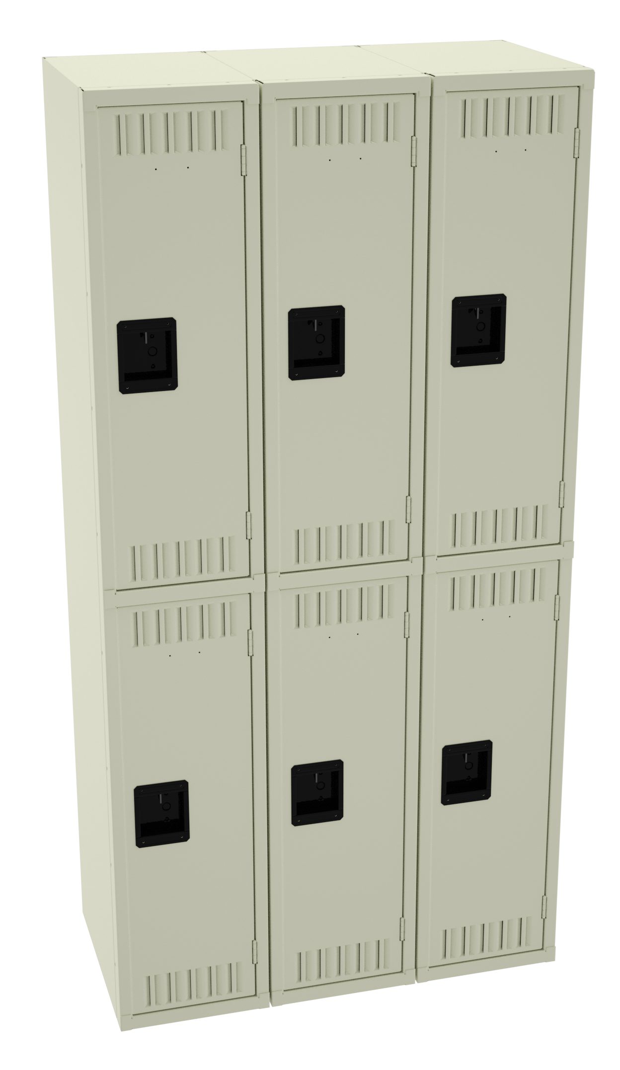 Double Tier lockers feature two openings per locker, giving you twice as many lockers in the same space as a single tier locker. Three coat hooks per opening. Positive 2 point locking system on doors. Flush louvers for ventilation. Door stiffeners add rigidity.