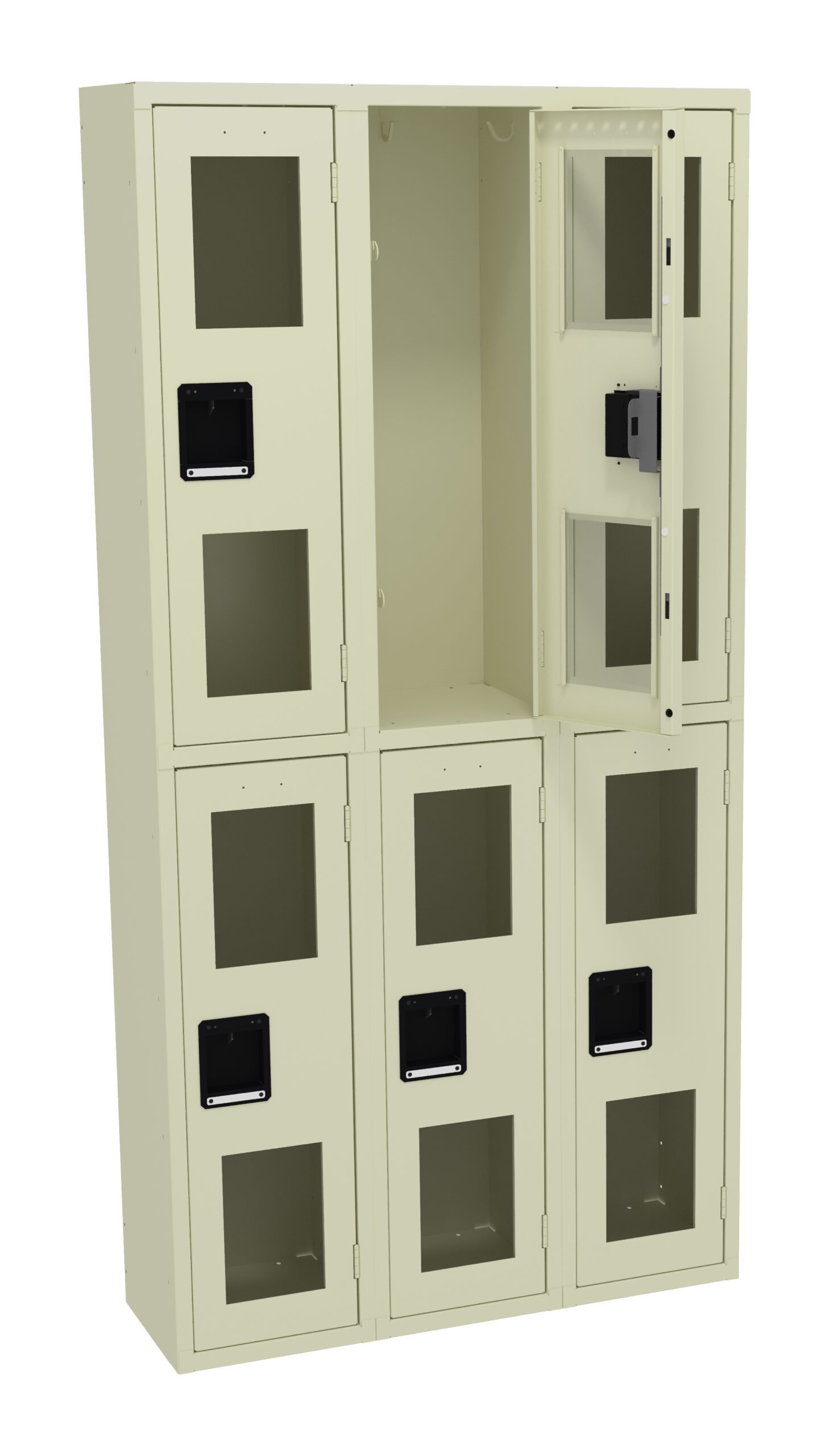 Double Tier Lockers offer an advantage in that twice the number of lockers can be placed in the same space as single tier lockers. Clear yet strong acrylic doors offer visibility of locker contents for security reasons. Secure acrylic door panels are positioned in steel channels and riveted to maintain the door’s integrity. Welded door frame is constructed of 16-gauge steel for added rigidity. Steel locking bar offers strength, while spring actuated latches provide secure and quiet latch operation. Extra-strong five-knuckle hinge with secured pin offers added content protection and long-life.