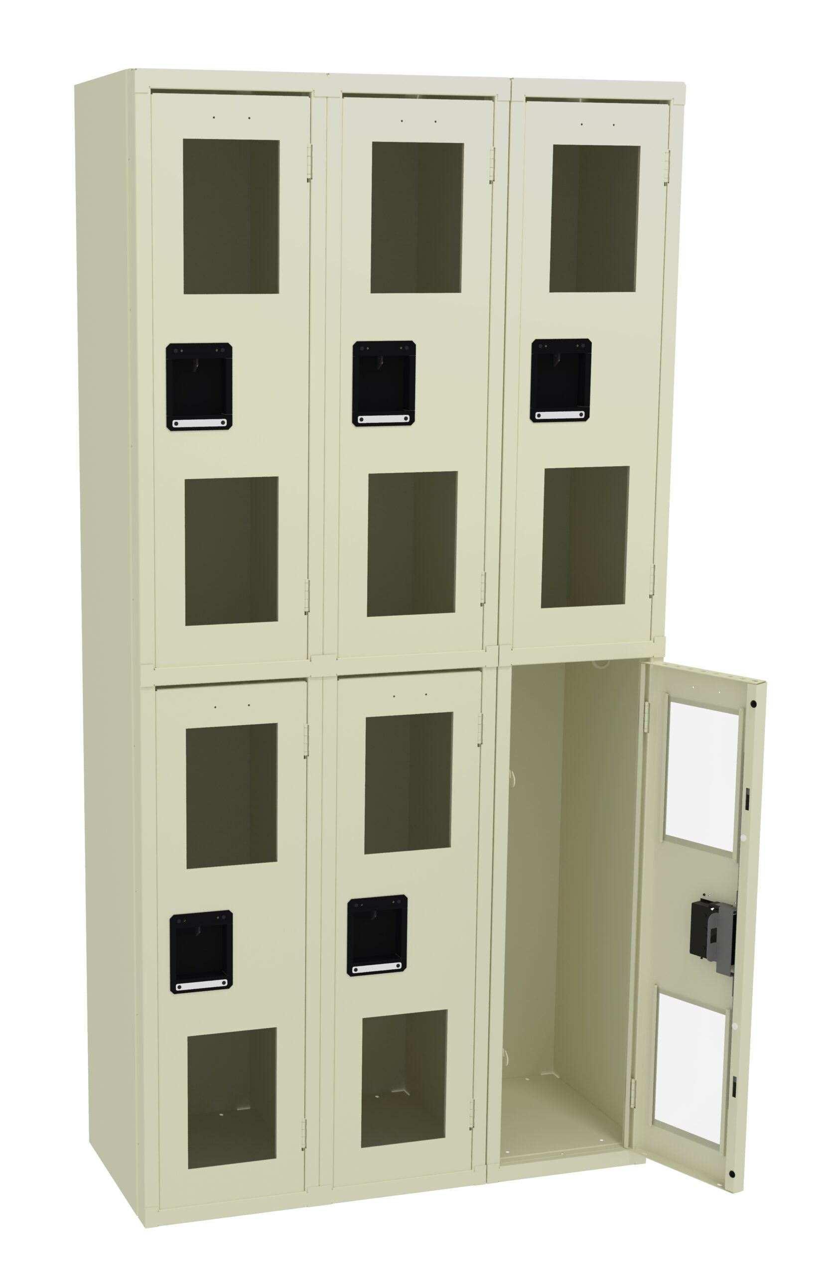 Double Tier Lockers offer an advantage in that twice the number of lockers can be placed in the same space as single tier lockers. Clear yet strong acrylic doors offer visibility of locker contents for security reasons. Secure acrylic door panels are positioned in steel channels and riveted to maintain the door’s integrity. Welded door frame is constructed of 16-gauge steel for added rigidity. Steel locking bar offers strength, while spring actuated latches provide secure and quiet latch operation. Extra-strong five-knuckle hinge with secured pin offers added content protection and long-life.