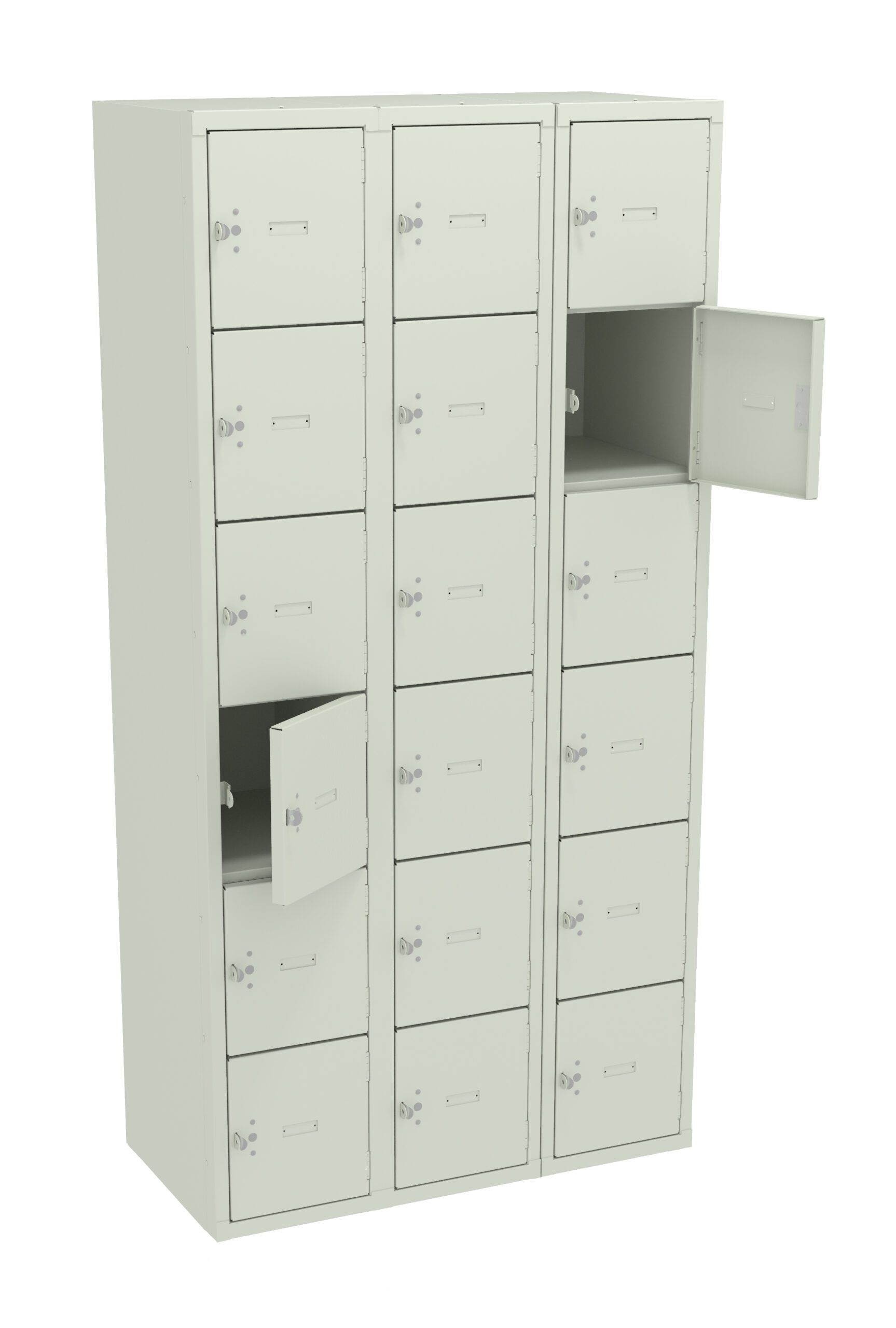 A beige metal locker unit with three columns and multiple compartments. Some of the locker doors are open, revealing empty storage spaces inside. Each door has a handle and a small rectangular label holder.