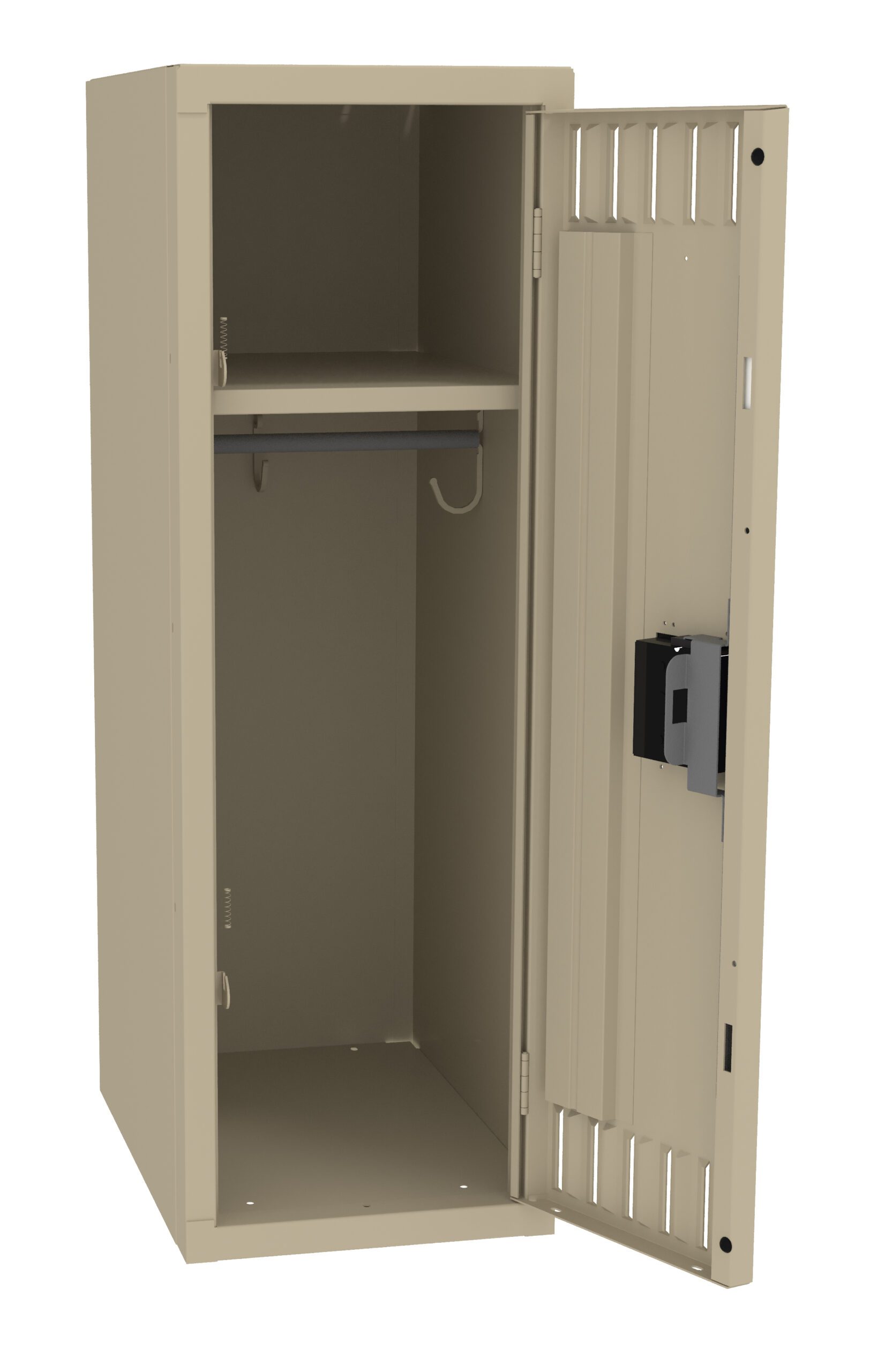 Single Tier Lockers are our most popular general purpose locker, ideal for factories, schools, hospitals. Positive 2 point locking system on doors. Flush louvers for ventilation. Door stiffeners add rigidity.