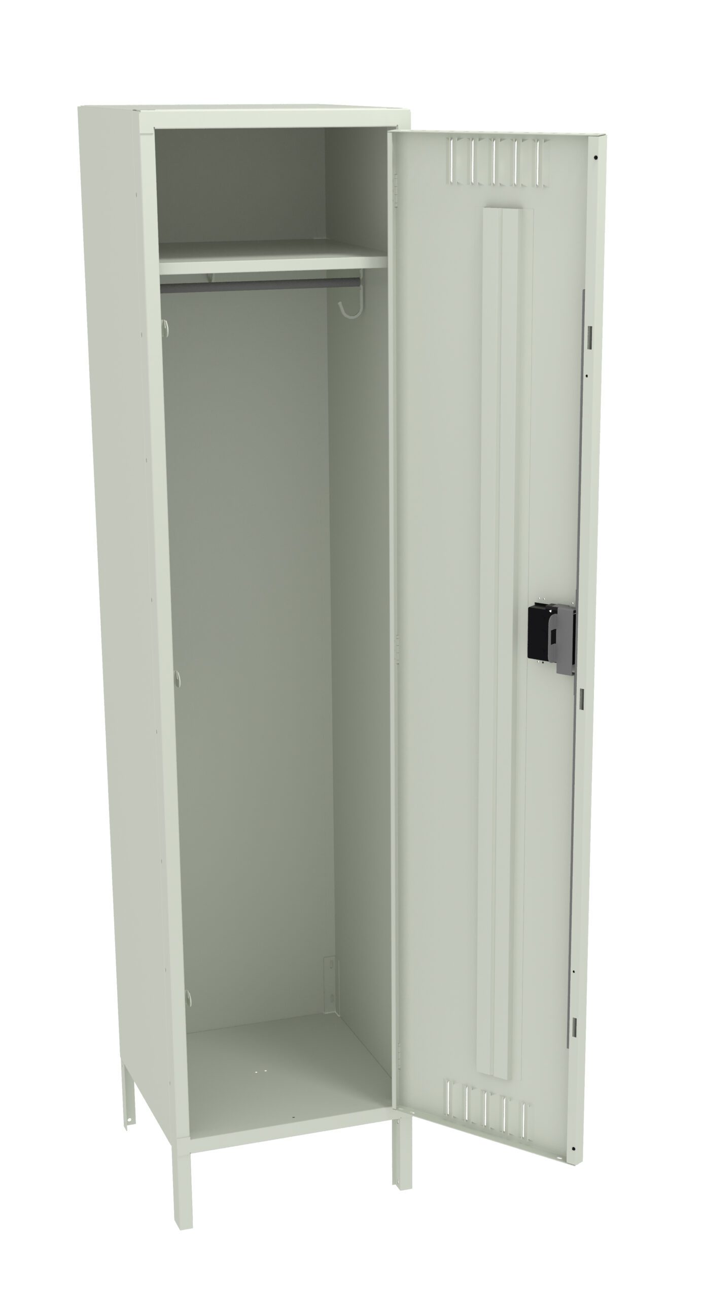 A tall, open metal locker with a single door. Inside, there is a rail for hanging items and a small shelf above. The locker is light gray with a black latch on the door.
