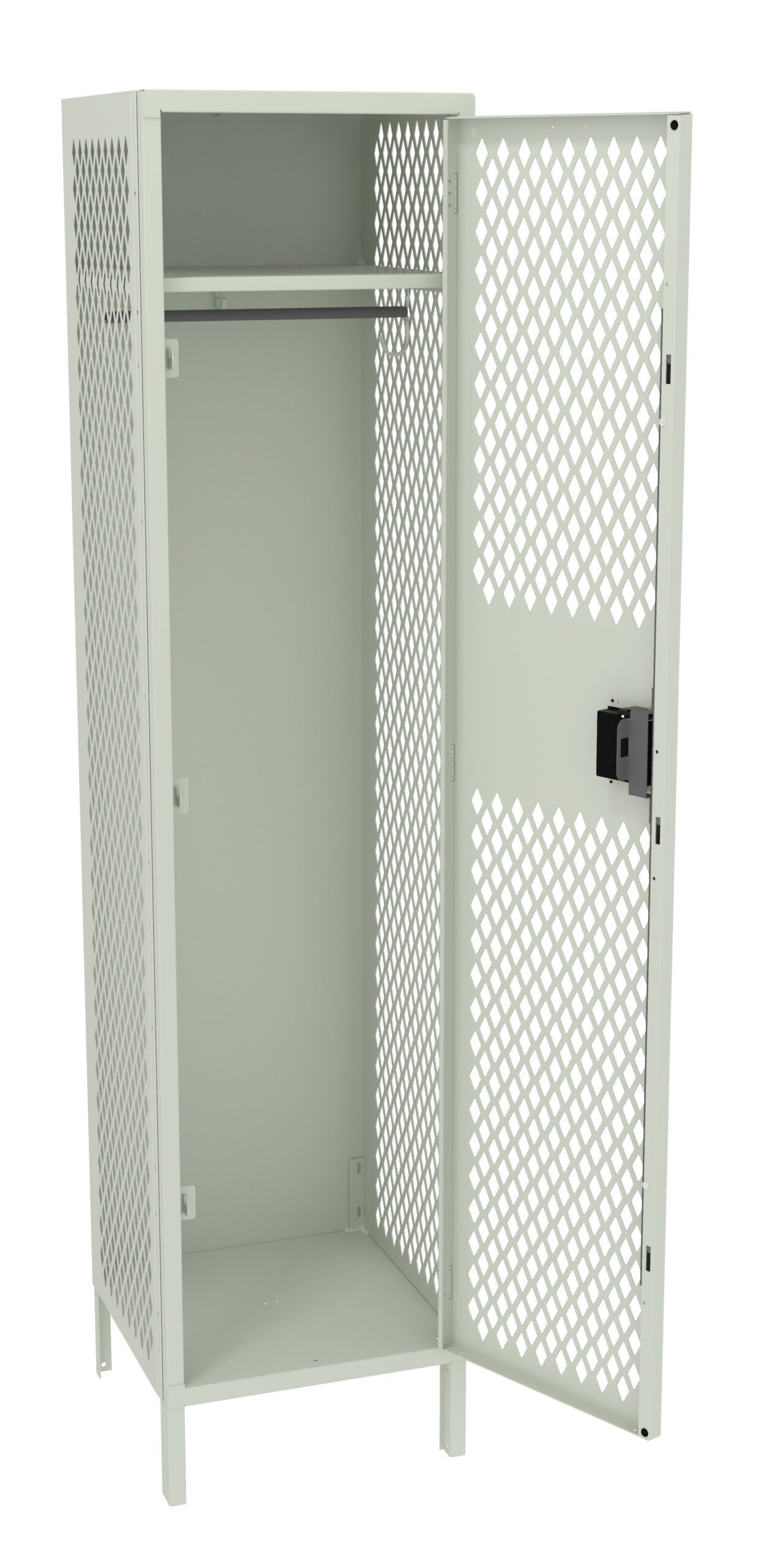 Perforated locker body ensures continuous airflow for maximum ventilation of clothing, etc. while providing complete visibility to contents. Single Tier Lockers are our most popular general purpose locker, ideal for factories, schools, hospitals. Three coat hooks per opening. Positive 3 point locking system on doors.
