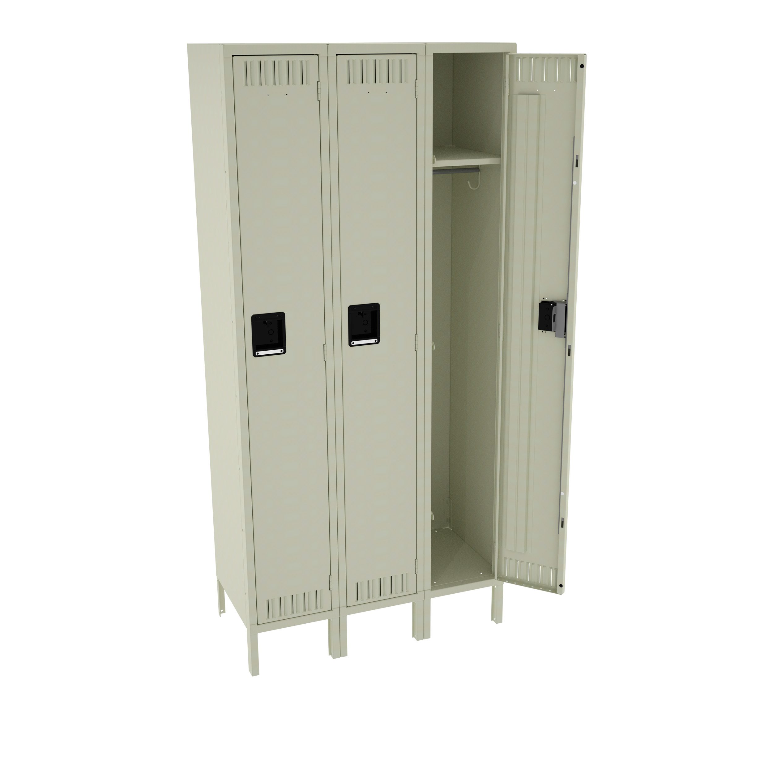 Three beige metal lockers are shown. Two lockers are closed, while the one on the right is open, revealing a shelf and a hook inside. They have black handles and small vents at the bottom.