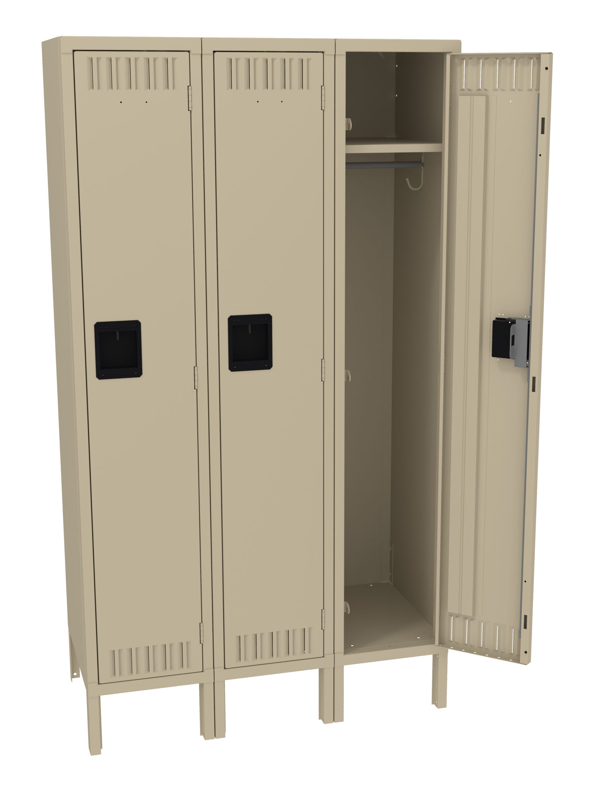 Single Tier Lockers are our most popular general purpose locker, ideal for factories, schools, hospitals. Three coat hooks per opening. Positive 3 point locking system on doors. Flush louvers for ventilation. Door stiffeners add rigidity.