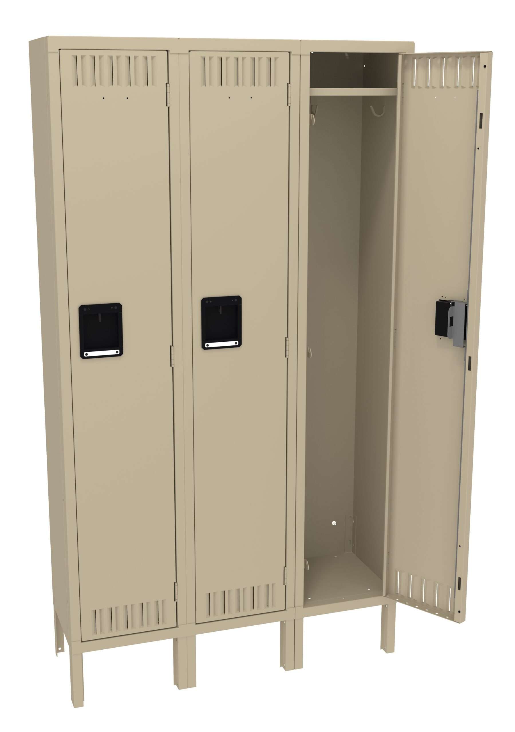 Single Tier Lockers are our most popular general purpose locker, ideal for factories, schools, hospitals. Three coat hooks per opening. Positive 3 point locking system on doors. Flush louvers for ventilation. Door stiffeners add rigidity.