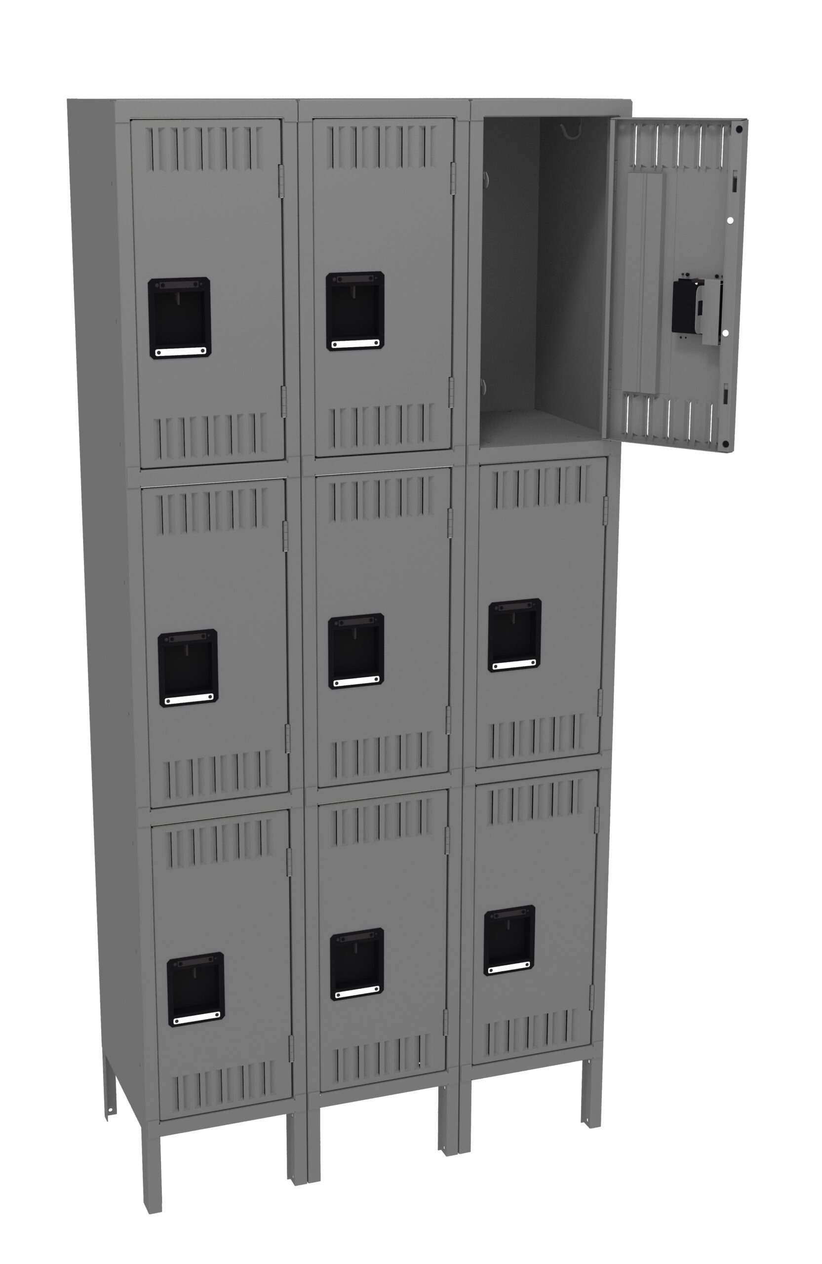 Triple Tier Lockers are ideal for health clubs, gymnasiums, and other applications where ample storage must be balanced with space savings. Three coat hooks per opening. Positive 2 point locking system on doors. Flush louvers for ventilation. Door stiffeners add rigidity.