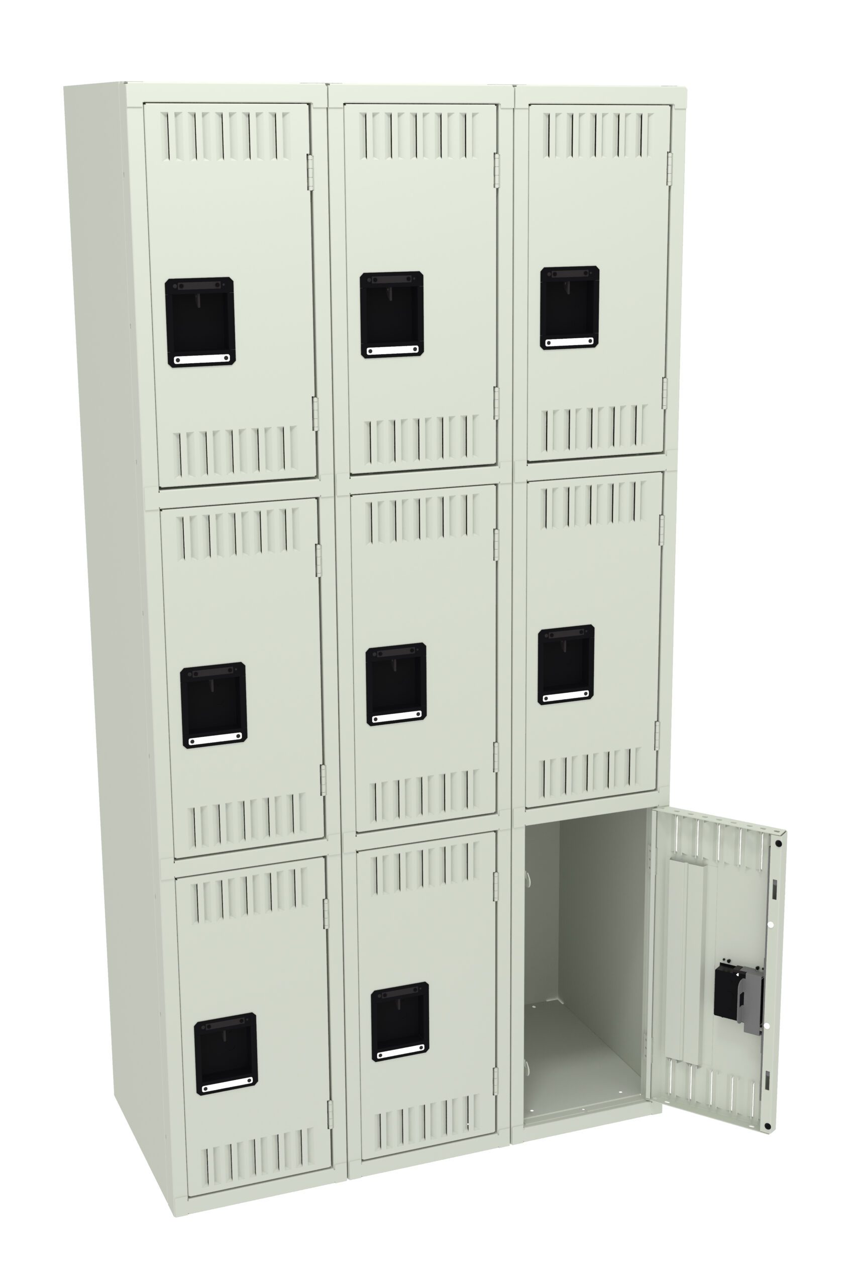 Triple Tier Lockers are ideal for health clubs, gymnasiums, and other applications where ample storage must be balanced with space savings. Three coat hooks per opening. Positive 2 point locking system on doors. Flush louvers for ventilation. Door stiffeners add rigidity.
