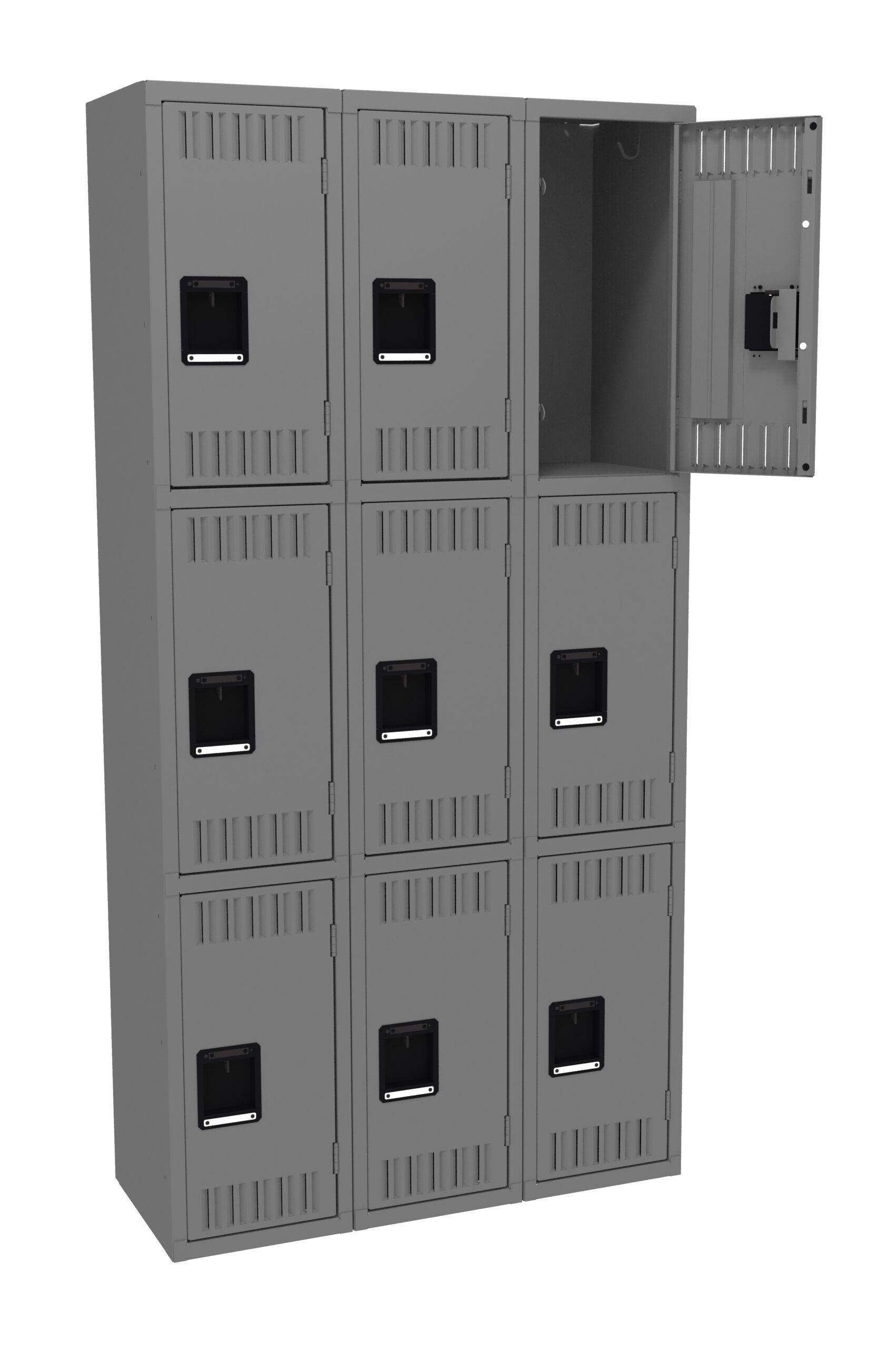 Triple Tier Lockers are ideal for health clubs, gymnasiums, and other applications where ample storage must be balanced with space savings. Three coat hooks per opening. Positive 2 point locking system on doors. Flush louvers for ventilation. Door stiffeners add rigidity.