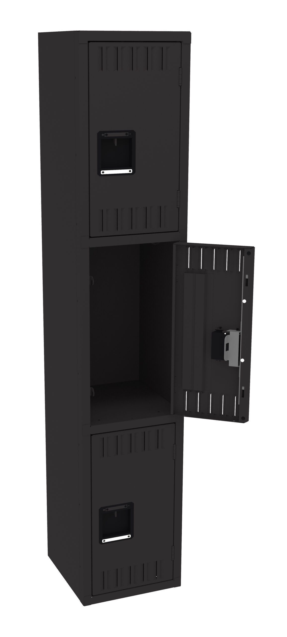 Triple Tier Lockers are ideal for health clubs, gymnasiums, and other applications where ample storage must be balanced with space savings. Three coat hooks per opening. Positive 2 point locking system on doors. Flush louvers for ventilation. Door stiffeners add rigidity.