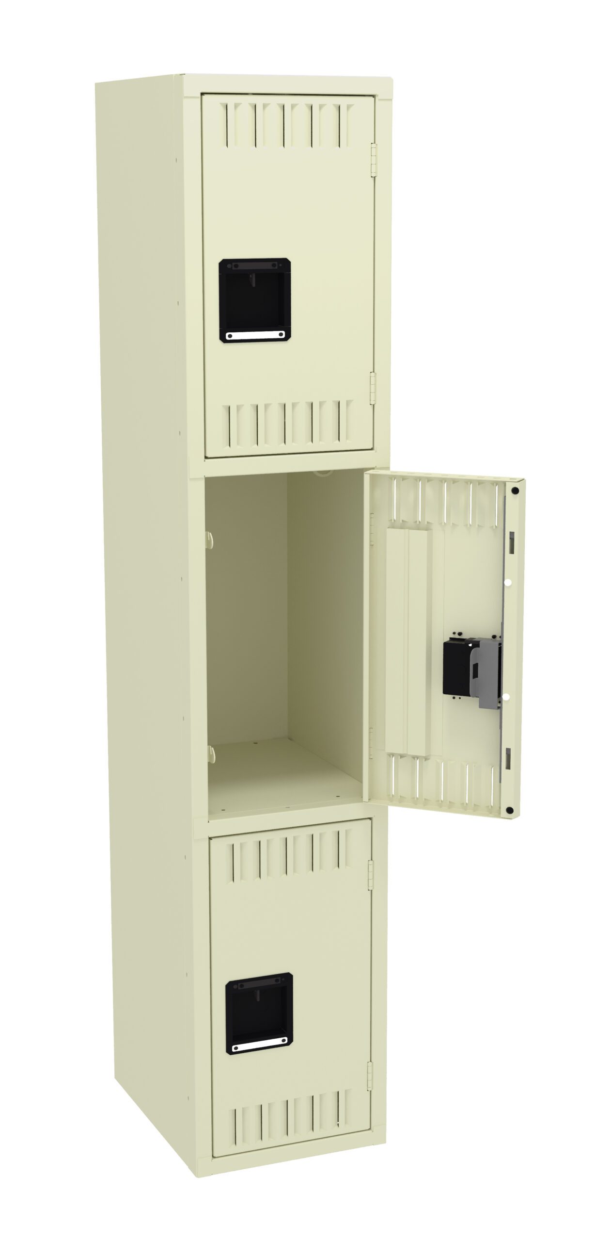 Triple Tier Lockers are ideal for health clubs, gymnasiums, and other applications where ample storage must be balanced with space savings. Three coat hooks per opening. Positive 2 point locking system on doors. Flush louvers for ventilation. Door stiffeners add rigidity.