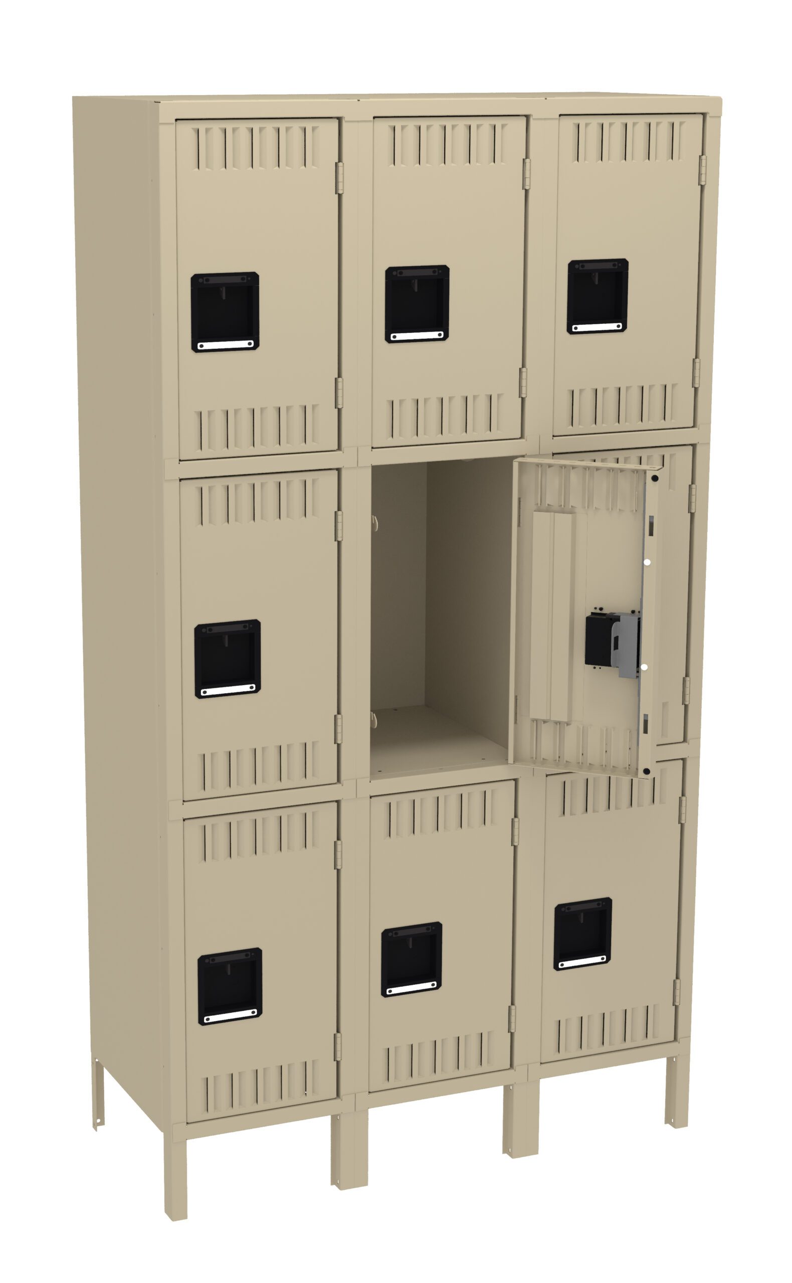 A beige, three-tier locker unit with nine compartments. One door in the middle row is open, revealing an empty interior. The lockers have black rectangular handles and ventilation slots.