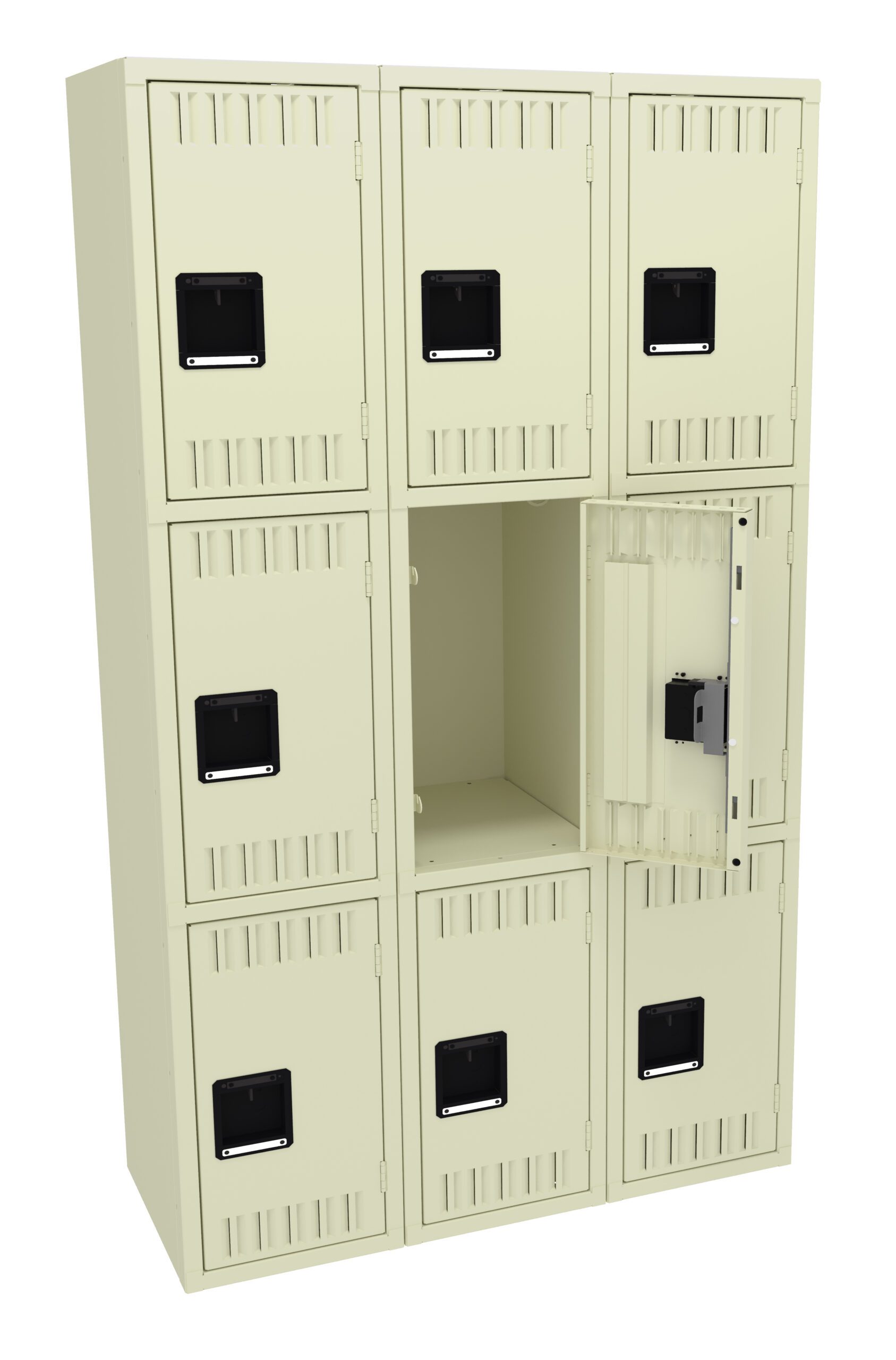 Triple Tier Lockers are ideal for health clubs, gymnasiums, and other applications where ample storage must be balanced with space savings. Three coat hooks per opening. Positive 2 point locking system on doors. Flush louvers for ventilation. Door stiffeners add rigidity.