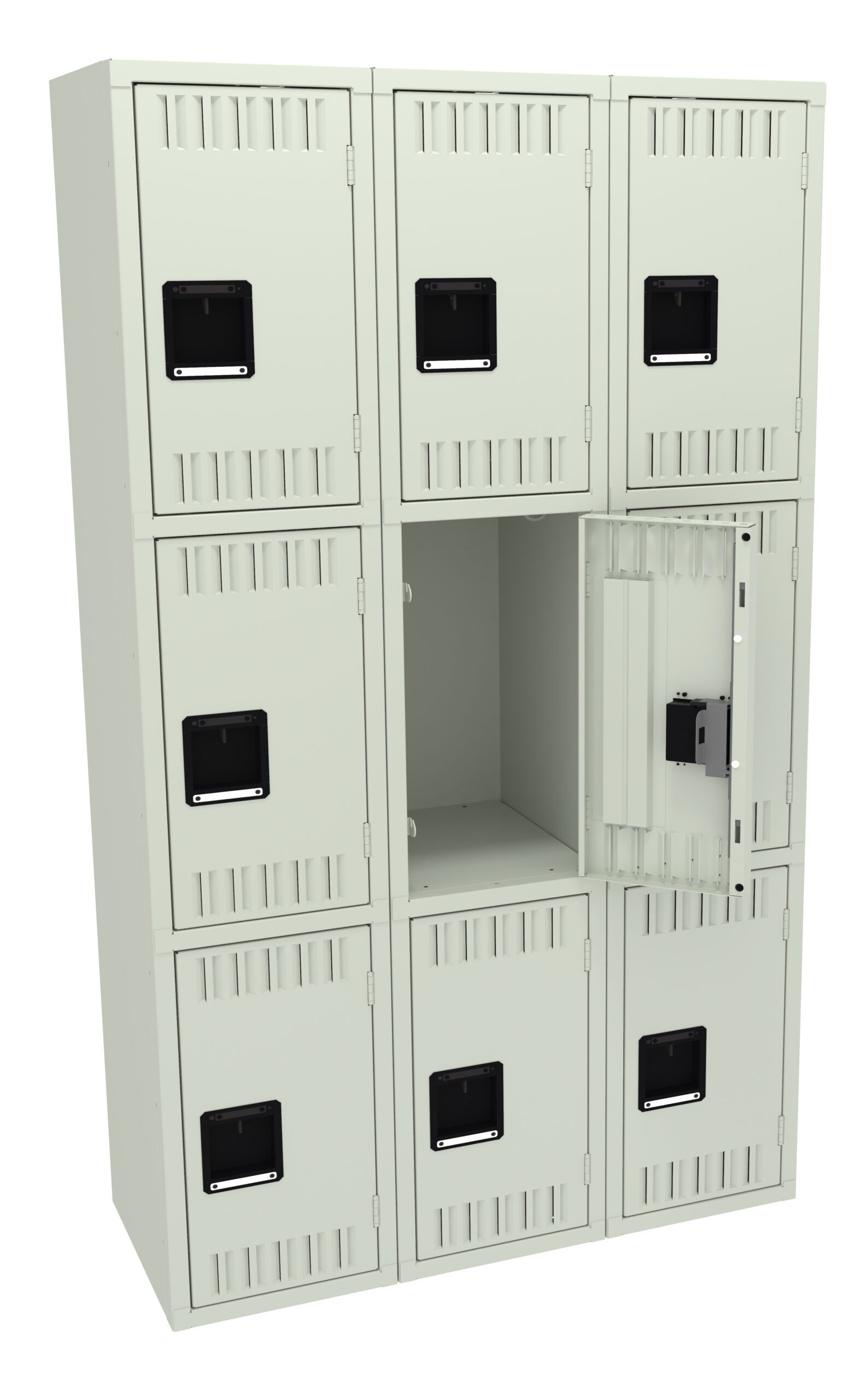 Triple Tier Lockers are ideal for health clubs, gymnasiums, and other applications where ample storage must be balanced with space savings. Three coat hooks per opening. Positive 2 point locking system on doors. Flush louvers for ventilation. Door stiffeners add rigidity.