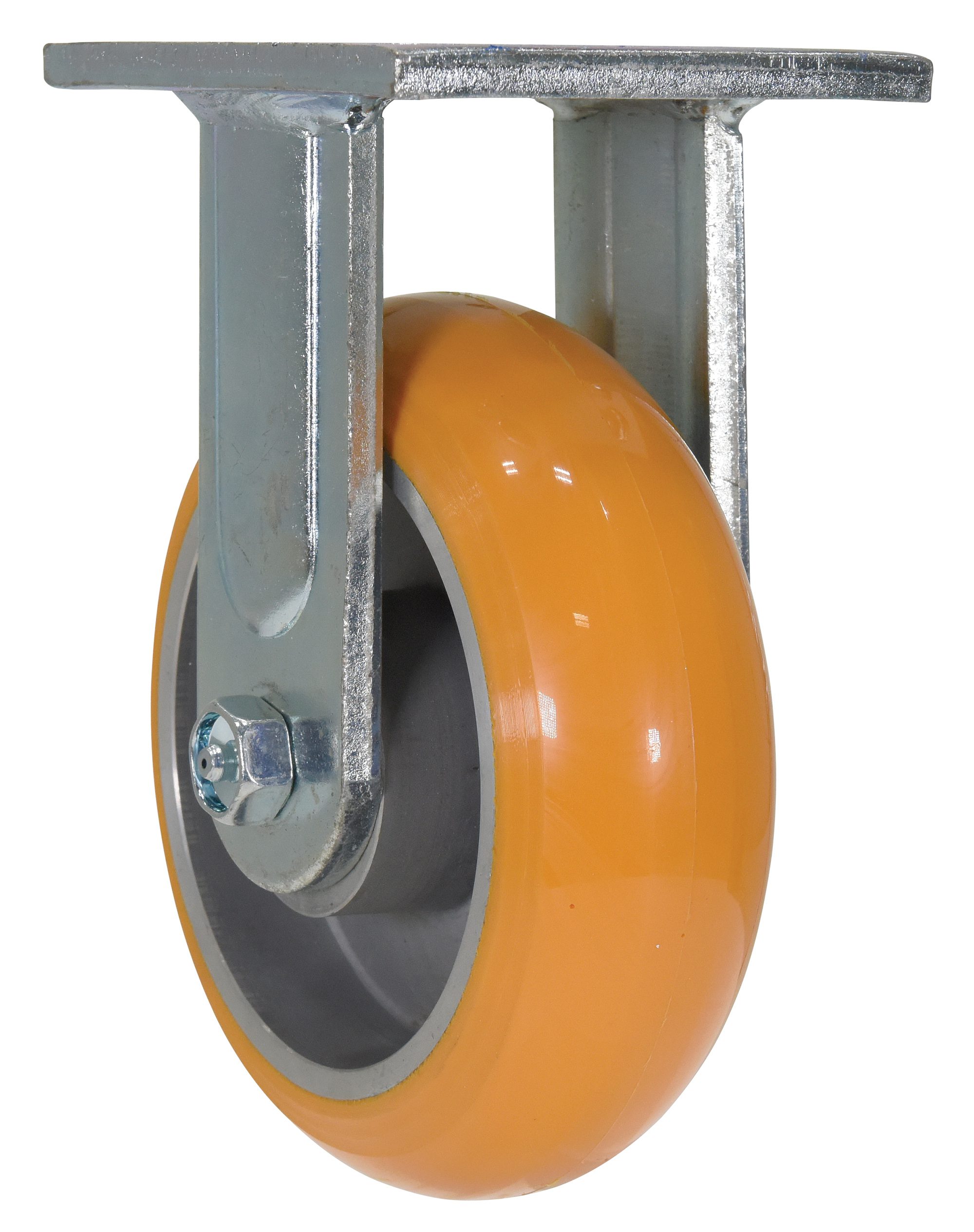 Made of exclusive premium grade proprietary polyurethane with ergonomic tread design tread (SI Heavy Duty®). Ideal for applications where superior strength and high ergonomic performance is required. The tread has been matched with a 100% maintenance free, double precision rigging that offers one of the smoothest rotations in the industry. Swivel sports a high-class three layered finish: brass, nickel, and polished off with chrome. Rigid comes standard in zinc. Orange tread color. 85 Shore A. Wheel core is constructed of aluminum.
