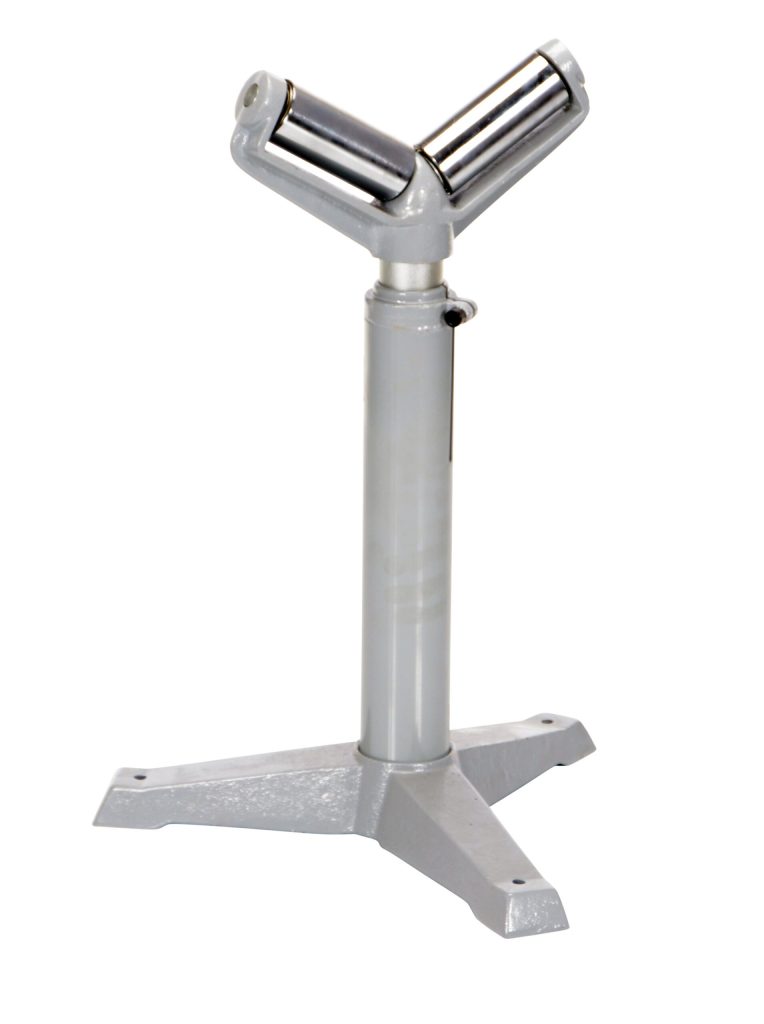 The Deluxe Roller Stand is designed for use as an extra hand when working with long materials. Each stand includes chrome plated rollers and heavy-duty cast-steel base. This Roller Stand is a v-groove roller design. The height of each stand is adjusted with a friction lock screw or a gas charged cylinder. The unit is great for use in machine and wood shops.