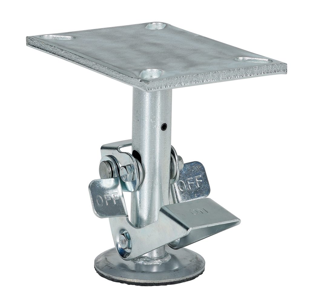 Floor Locks may be used on platform trucks, fixture dollies, or equipment with casters. Simple foot pressure immobilizes equipment. Locks when large friction face is pressed against the floor. To release simply kick release rod. Brake is independent of casters and can be installed to any convenient location on the cart. Vertical mounting plate designed to mount to sides of carts and other portable products. The spring loaded pad accommodates uneven floors. Units mount with pad 1.” off the floor when retracted.