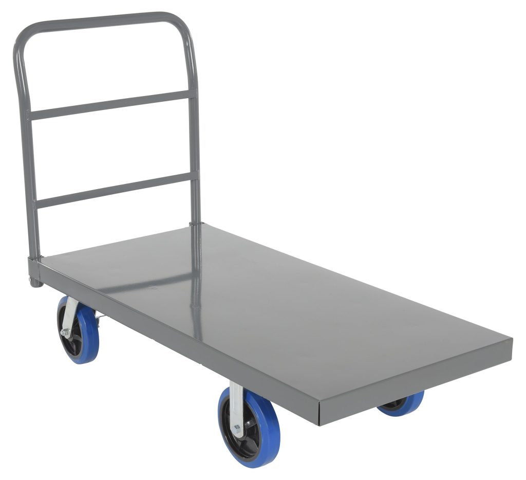 Steel Platform Truck with solid, smooth steel deck is all welded and features structural reinforcement underneath for extra strength. Includes one (1) removable high-polished steel handle and rolls smoothly casters. Comes standard with a floor lock.