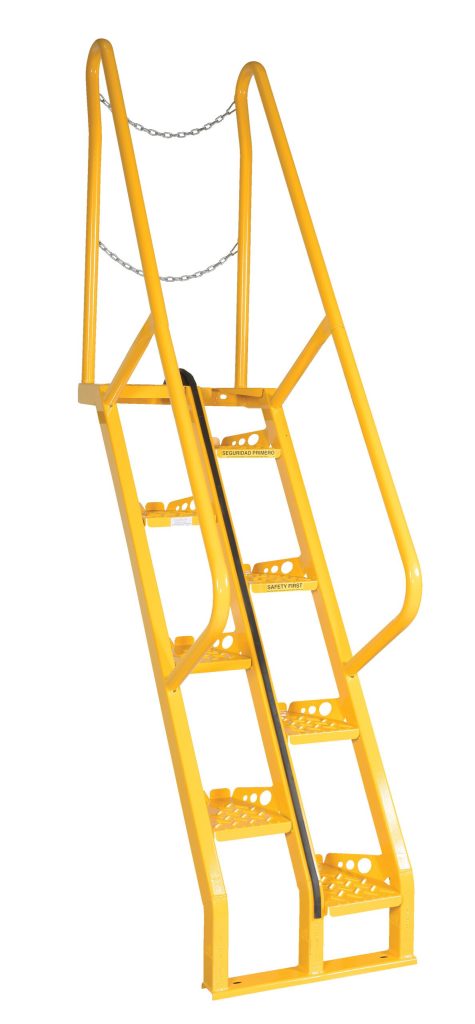 Alternating-Tread Stair design offers a shorter span than traditional steps. Features handrail on each side of unit, dual safety chain at the top of the stair and formed steel steps with raised surfaces for better traction. Welded steel construction with bolt-on handrails.