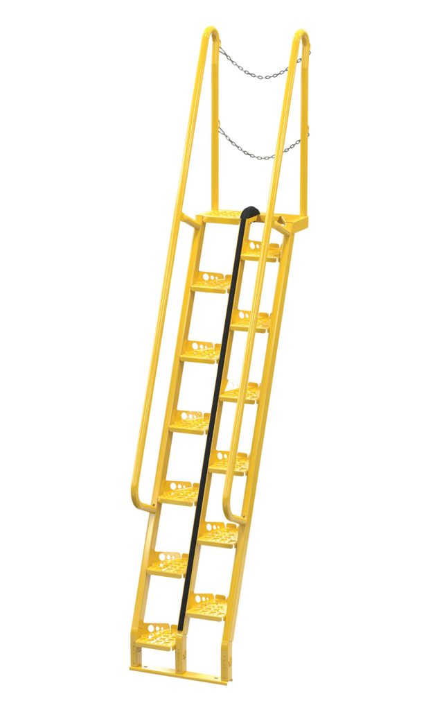 Alternating-Tread Stair design offers a shorter span than traditional steps. Features handrail on each side of unit, dual safety chain at the top of the stair and formed steel steps with raised surfaces for better traction. Welded steel construction with bolt-on handrails.