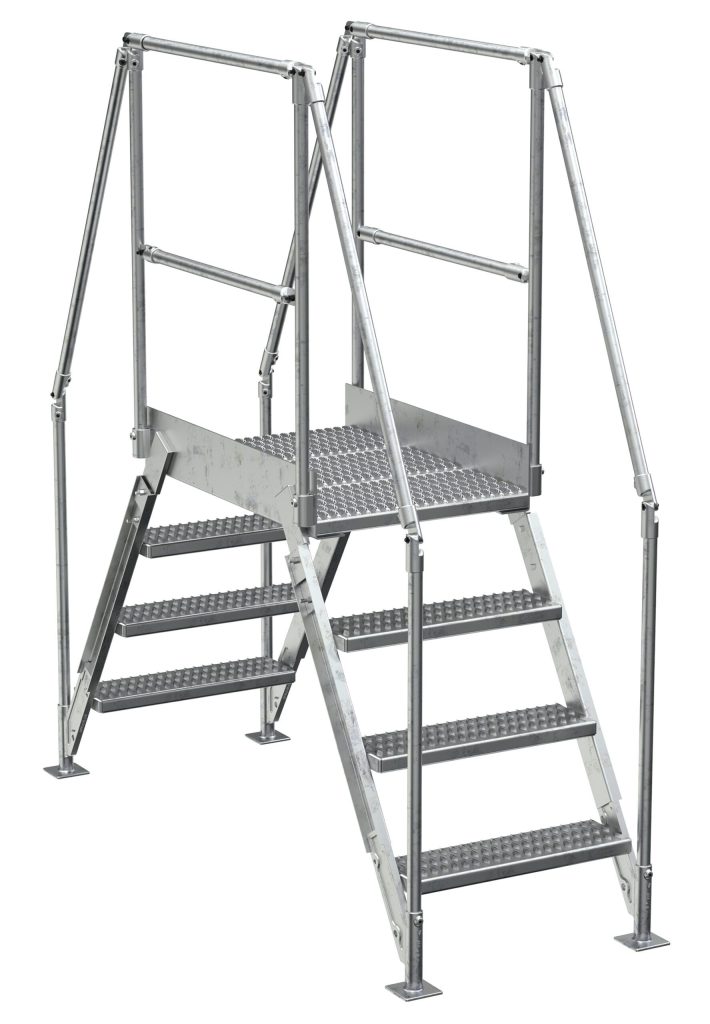 The Cross-Over Ladder mounts where you need permanent access at crossover points. The upper platform features removable two sided handrail with mid-rail and fixed toeboards to prevent objects from rolling off. Serrated steps for extra grip and safety. Ground legs include floor mounting pads. Unit must be anchored to the floor. Cross-Over Ladder is all welded steel construction but can be knocked-down for storage and shipping. Hot Dip Galvanized finish.