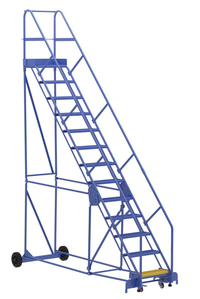 The Rolling Warehouse Ladder is a great addition to material handling and shipping facilities. The powder coated steel construction maintains a strong, durable design throughout a lifetime of use. The steps include a grip strut design and a 50° climb angle that promotes stability while climbing and/or descending the ladder. The bottom step is colored yellow for additional safety and minimization of injuries when traversing the ladder with heavy loads.