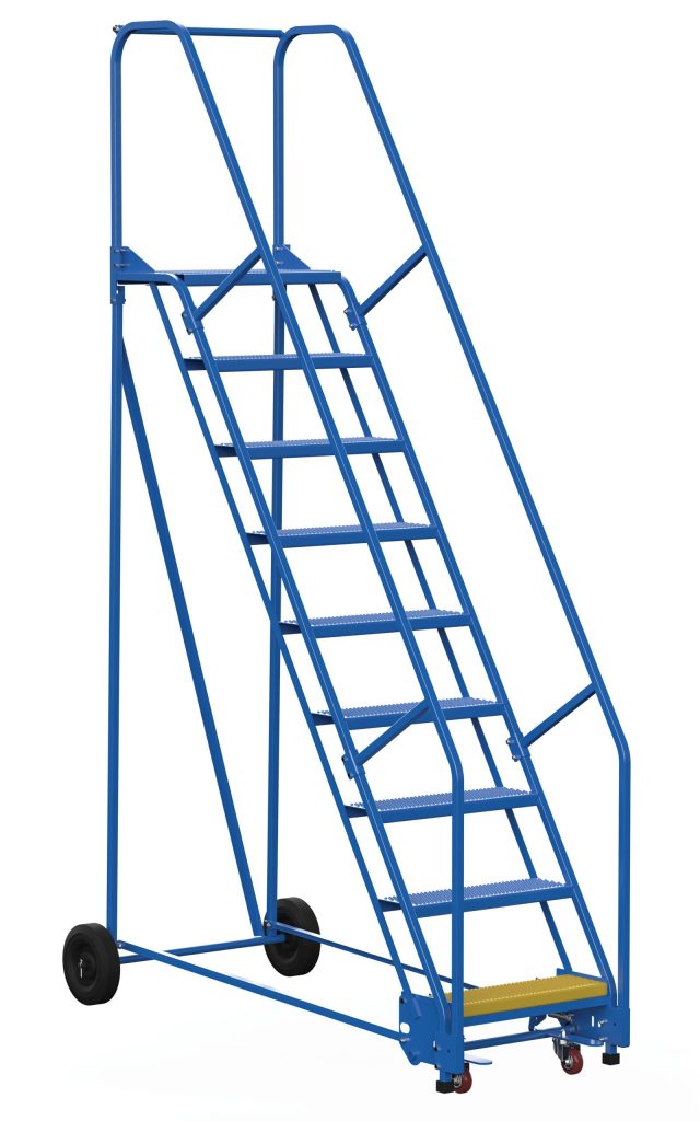 The warehouse ladders are a great addition to the material handling and shipping facilities. The strong welded construction is powder coated for a sleek reliable finish that will stay durable throughout daily use. The ladder construction promotes safety through a bottom yellow step that indicates the end of the unit. The unit can be locked in place by pressing the levers below the bottom step. Once levers are engaged the ladder cannot be moved. A resilient handrail offers stability while climbing and exiting the ladders.