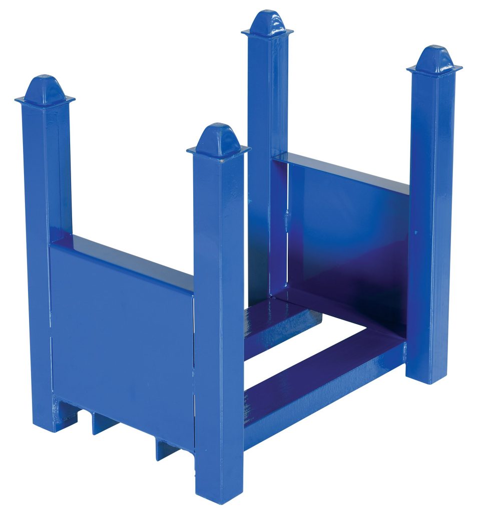 The Vestil Stackable Bar Cradle 5600 Lb 22 In Long is a blue metal stackable rack with four corner posts, shown upside down. Designed for industrial storage, it supports organization with a smooth, painted surface that reflects light, highlighting its robust construction.