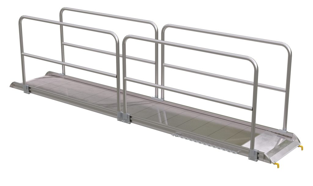 The Aluminum Walk Ramp with hand rails enables delivery men/women, shippers, and receivers to load and unload trucks when docks are unavailable. Heavy-duty steel chains with steel grab hooks are attaches to each side of ramp for safely securing ramp to truck. Constructed of strong aluminum alloy with non-skid tread surface. The ramp is lightweight and easy to handle. This steel hook style mounts onto the truck extensions.