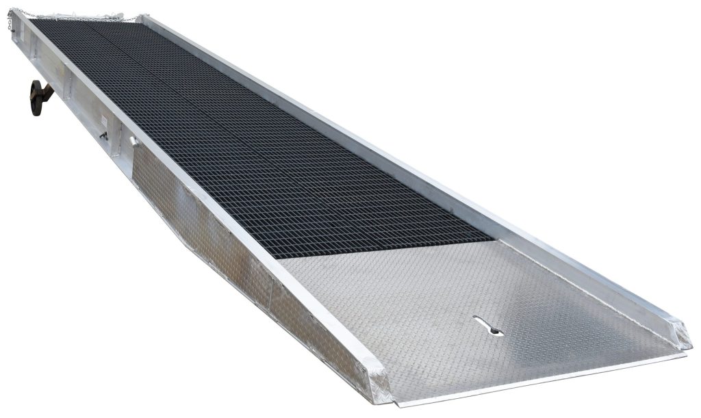 The portable Aluminum Yard Ramp with Steel Grating has a unique design that allows one person to position the ramp, adjust its service height, and load or unload trailers from ground level. It includes hand pump hydraulic lift, safety pressure relief valve, anchor chains, and tow bar pocket.