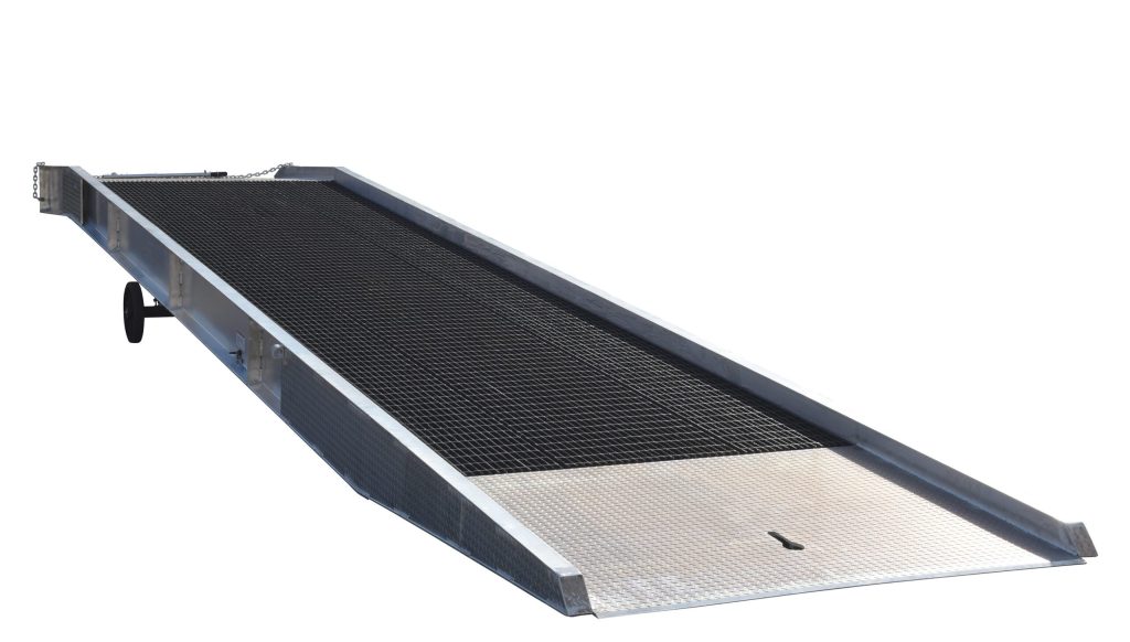 The portable Aluminum Yard Ramp with Steel Grating has a unique design that allows one person to position the ramp, adjust its service height, and load or unload trailers from ground level. It includes hand pump hydraulic lift, safety pressure relief valve, anchor chains, and tow bar pocket.