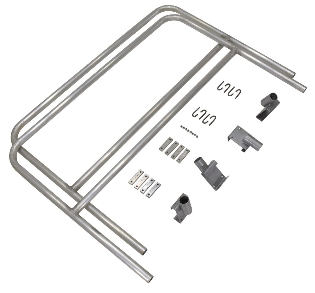 A disassembled kit for the Vestil Aluminum Walk Ramp Rail Retro Fit 9 Ft comprises two curved metal rods, multiple smaller parts, brackets, connectors, and screws, all displayed on a white background.