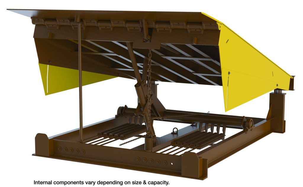 A large brown mechanical system with a partially open yellow lid reveals metal components below. Like the Vestil Pull Chain Mech Dockleveler 30K 7X5 Ft, it states at the bottom, Internal components vary depending on size & capacity.
