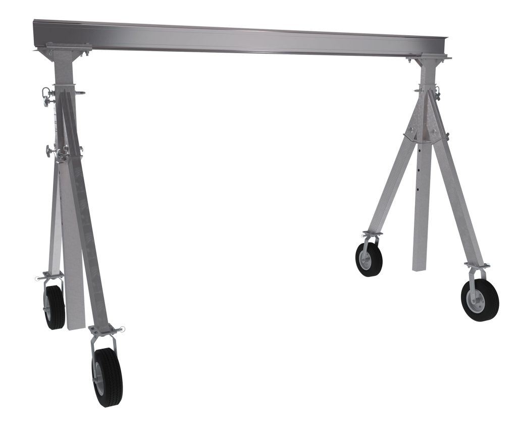 The Adjustable Height Aluminum Gantry Crane combines lightweight and rigid, sturdy construction into one unit. The all aluminum construction of this gantry crane makes it corrosion resistant and perfect for outdoor use. The lightweight I-Beam allows height adjustment without the need of a hoist or fork truck. All pined connections make it possible for single person set up and take down in just minutes. Included are two (2) straps, allowing one person to transport the gantry crane in one neat package. Four-way locking pneumatic casters included.