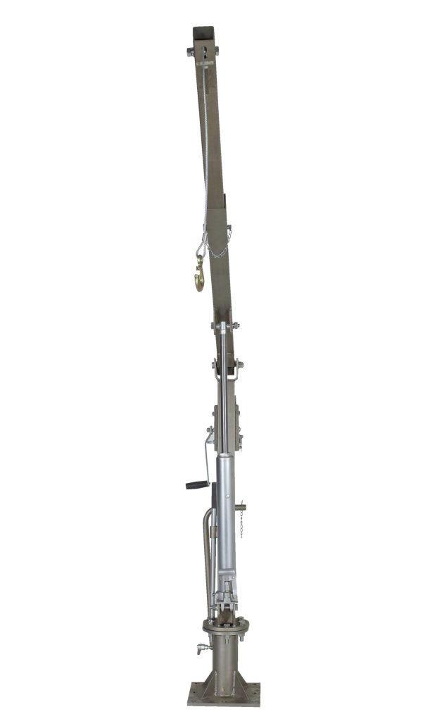 This Stainless Steel Winch Operated Truck Jib Crane lifts items from ground to truck bed height, then rotate into cargo area. Includes telescopic boom design with manual hydraulic hand pump to pivot boom up and down. Manual cable winch to lift and lower loads. Unit comes with one grab hook, one chain slot lock, and one sling hook with latch. Unit is designed for vertical lifting only. Do not use unit for lifting personnel or overhead lifting.