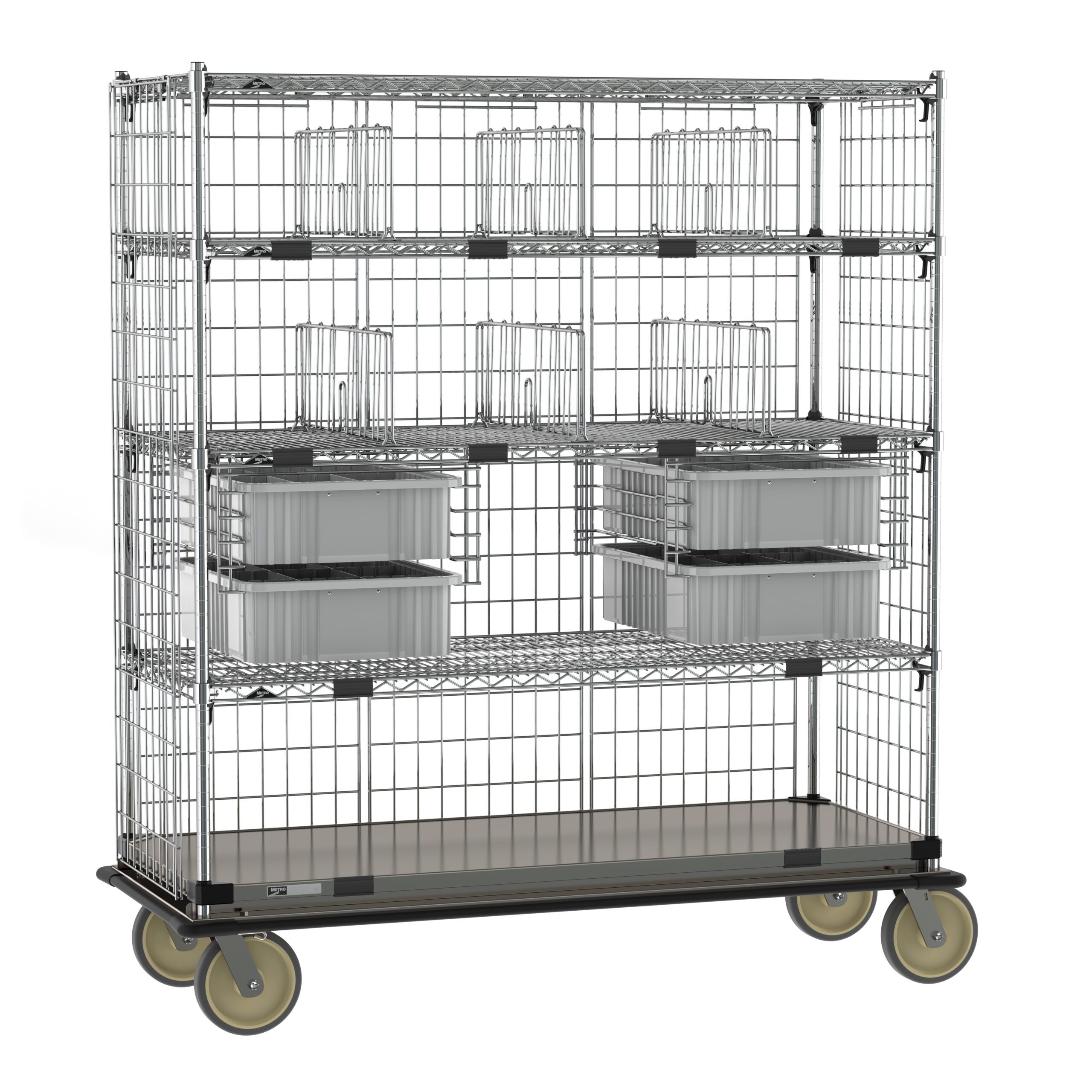 The Metro ECM56XC Super Adjustable Super Erecta Deluxe Transport and Exchange Cart, measuring 24 x 60, is industrial yet functional with a stainless steel bottom shelf, four large wheels, multiple shelves, wire cages, and gray plastic bins for versatile storage.