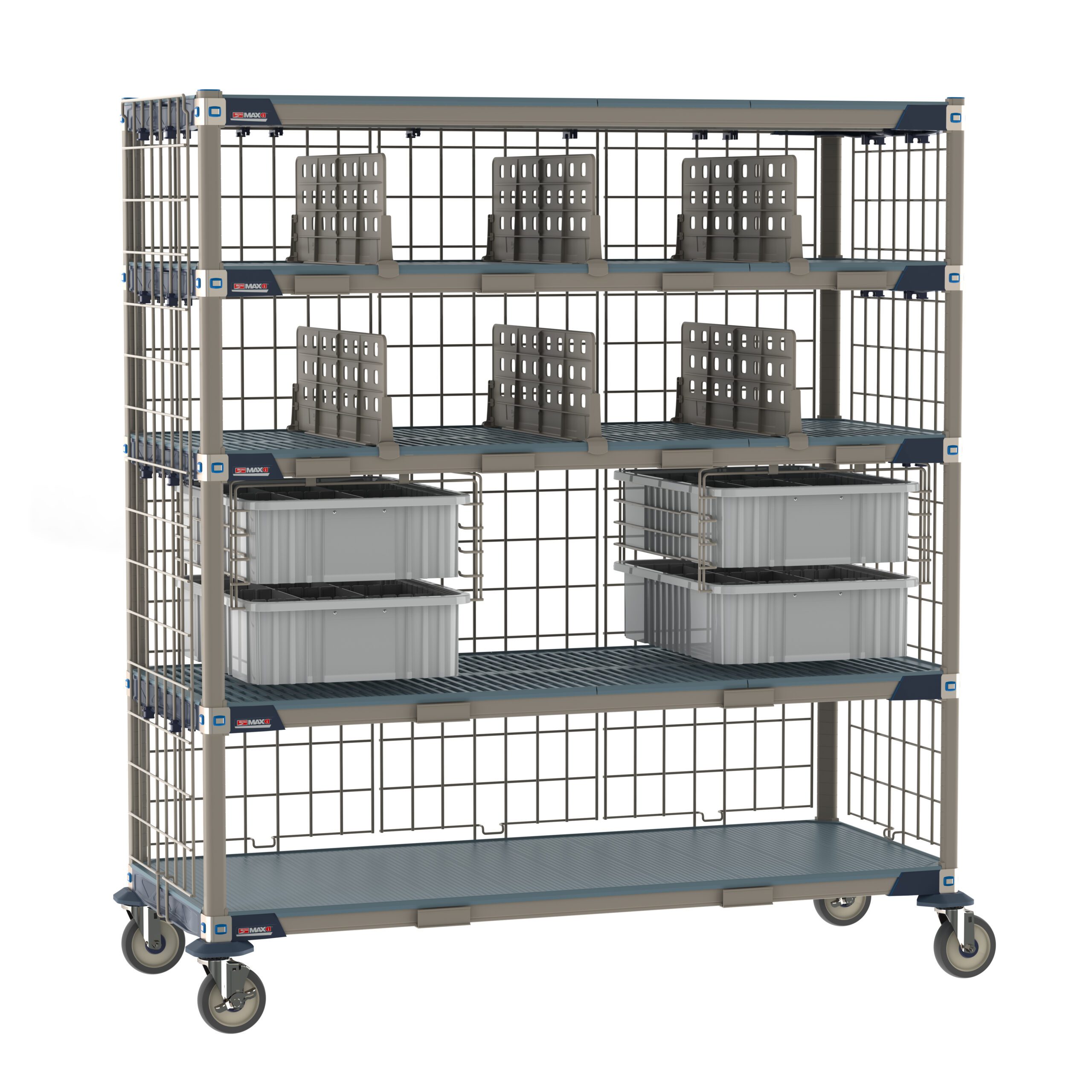 - Complete Organization: Includes four open grid shelves, one solid bottom shelf, side and back enclosure panels, MetroMax tote slides, 6″ deep tote boxes with dividers, shelf dividers, and twelve label holders.