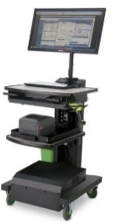 A mobile workstation with a computer monitor displaying graphs and charts. It has multiple shelves, one holding a printer, and is mounted on wheels for easy mobility.