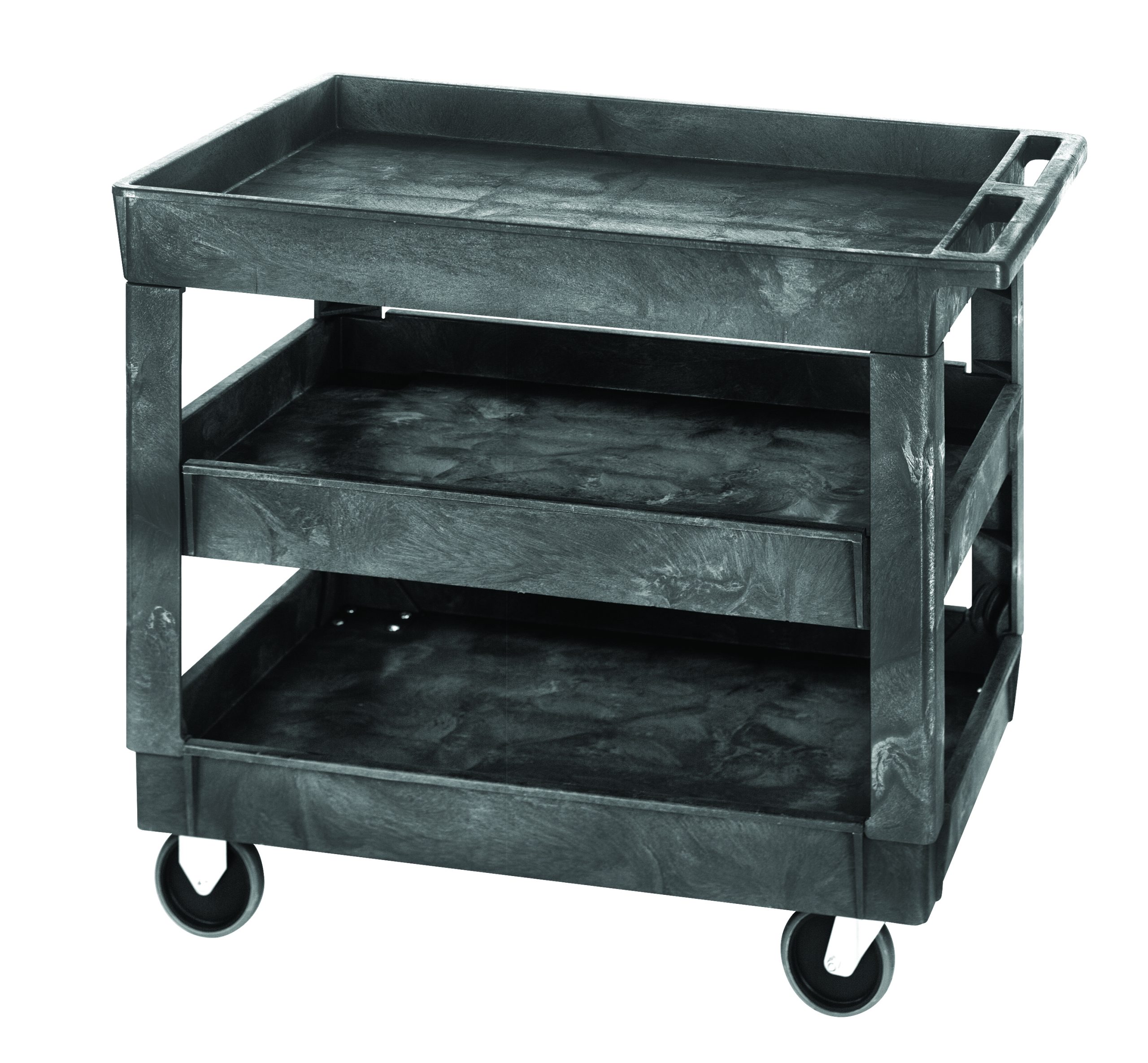 Utility Cart, (3) shelves, 550 lb. capacity, push handle, (4) 5″ casters: (2) rigid and (2) swivel, polymer, gray, shipped KD