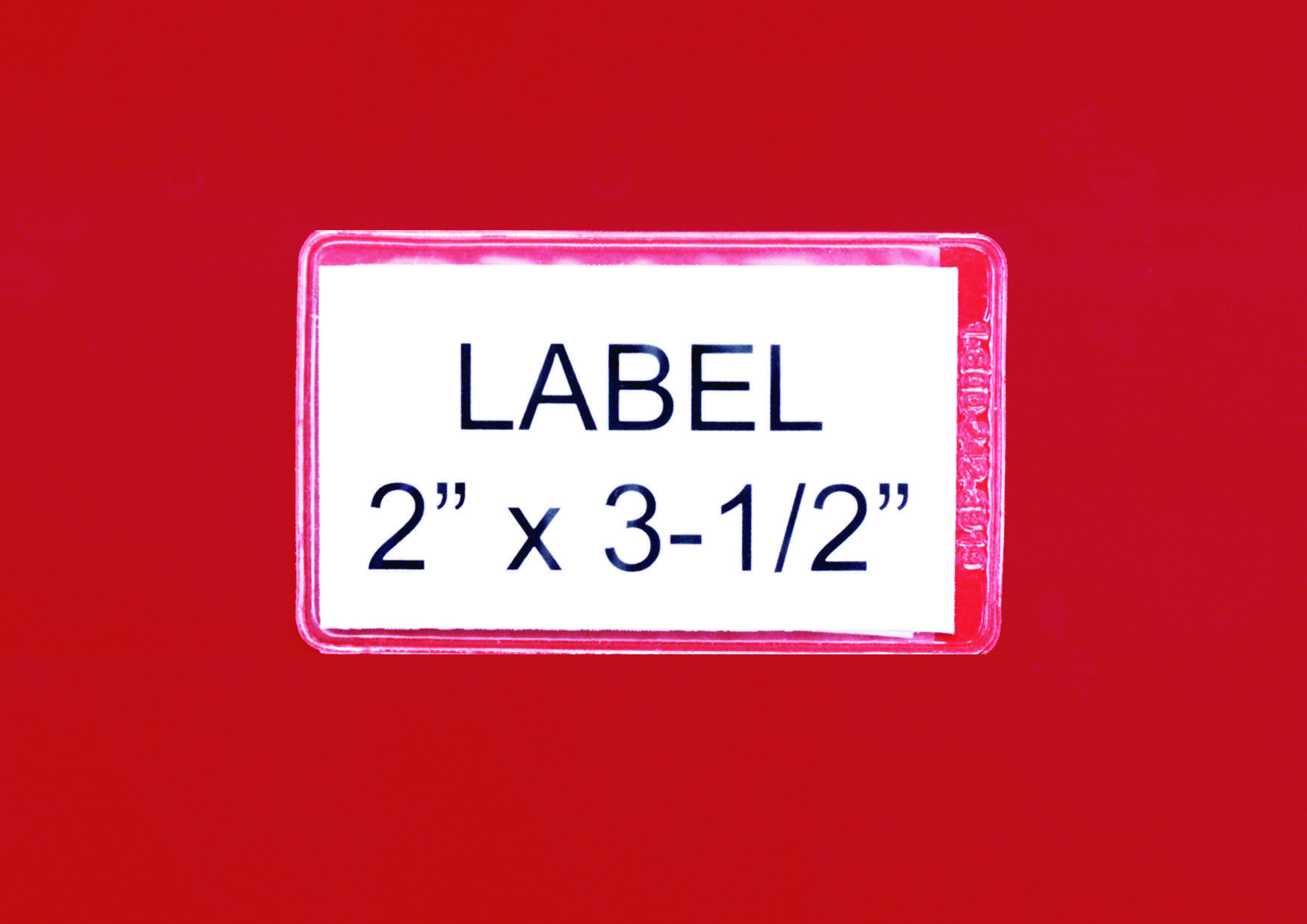 A close-up of a white label against a red background showcases the Quantum Adhesive Label Holder with clear black text, measuring 3-1/2 x 2. Ideal for inserts, this design comes in a convenient pack of 24.