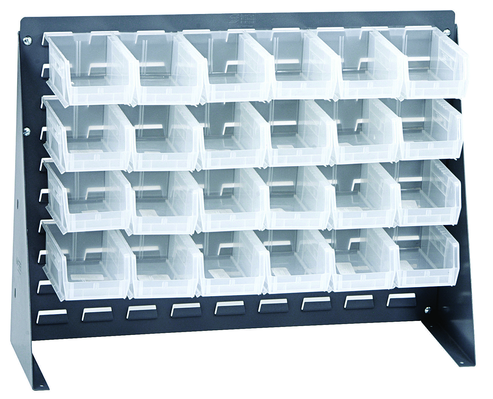 Quantum Bench Rack, 27-3/4″L X 8″W X 21″H, 16 Gauge Steel Louvered Model, Includes: (24) 7-3/8″L X 4-1/8″W X 3″H Clear Bins, Gray Enamel Finish