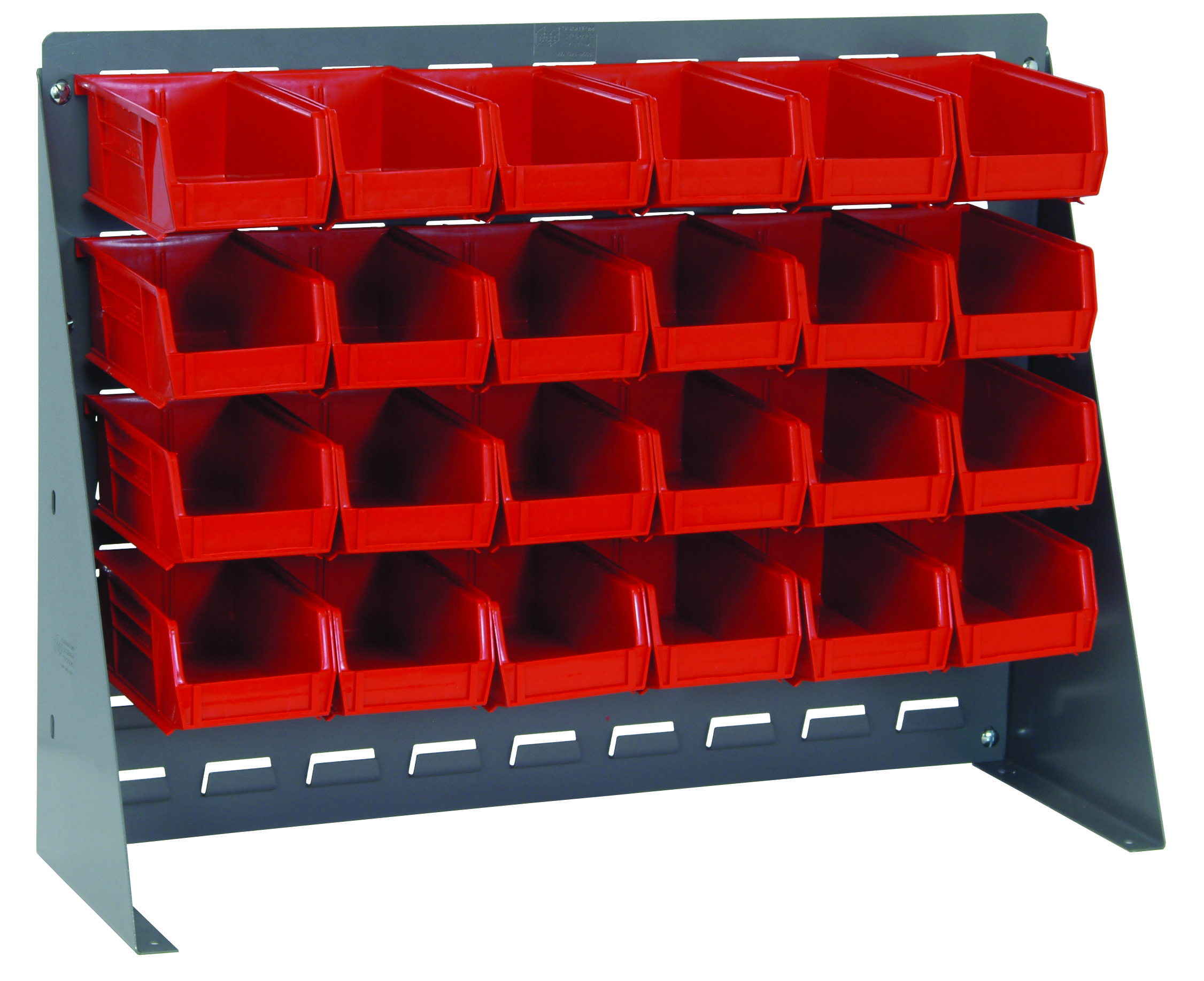 Quantum Bench Rack, 27-3/4″L X 8″W X 21″H, 16 Gauge Steel Louvered Model, Includes: (24) 7-3/8″L X 4-1/8″W X 3″H Red Bins, Gray Enamel Finish