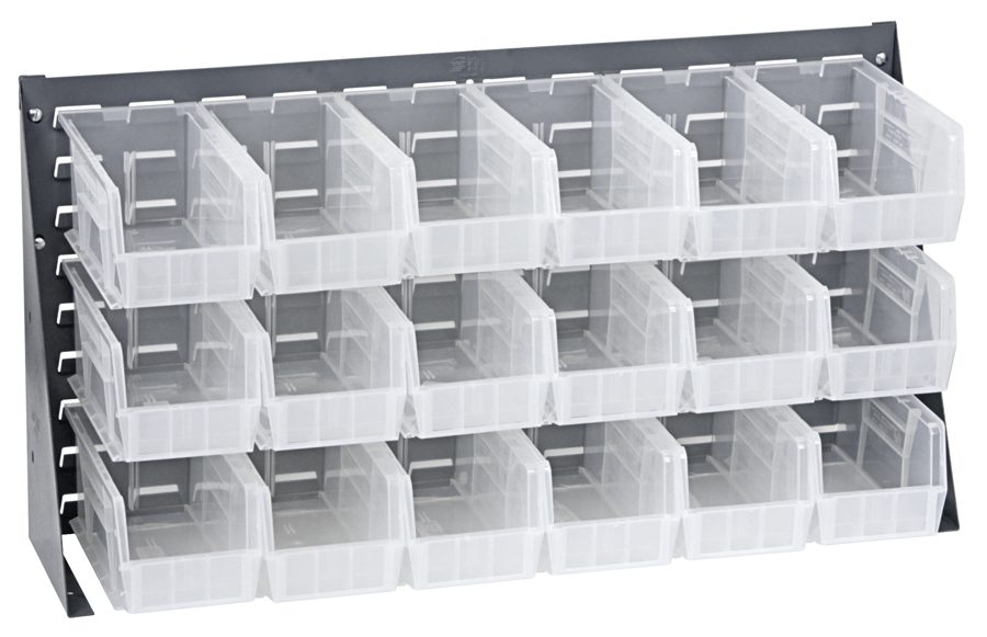 Quantum Bench Rack, 36″L X 8″W X 19″H, 16 Gauge Steel Louvered Model, Includes: (18) 10-7/8″L X 5-1/2″W X 5″H Clear Bins, Gray Enamel Finish