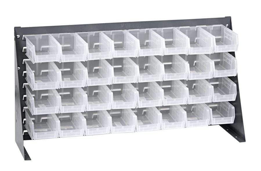 Quantum Bench Rack, 36″L X 8″W X 19″H, 16 Gauge Steel Louvered Model, Includes: (32) 7-3/8″L X 4-1/8″W X 3″H Clear Bins, Gray Enamel Finish