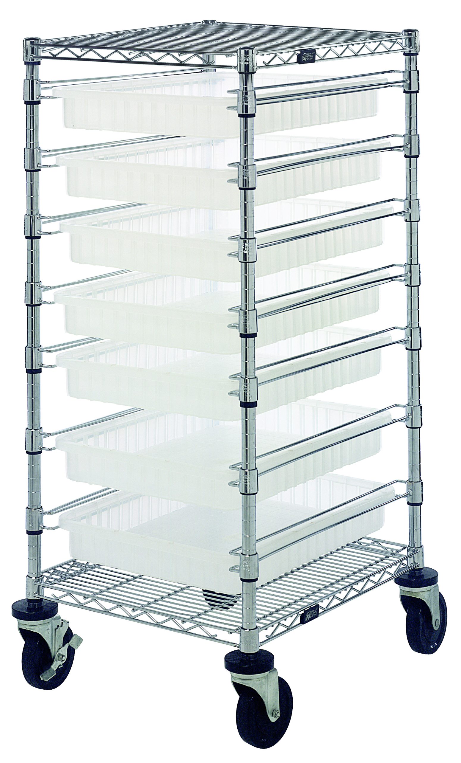 Quantum Bin Cart, Mobile, 21″W X 24″L X 45″H, Includes: (2) Wire Shelves, (7) 22-1/2″L X 17-1/2″W X 3″H (DG93030) Clear Bin And Set Of Casters, Chrome Plated Finish